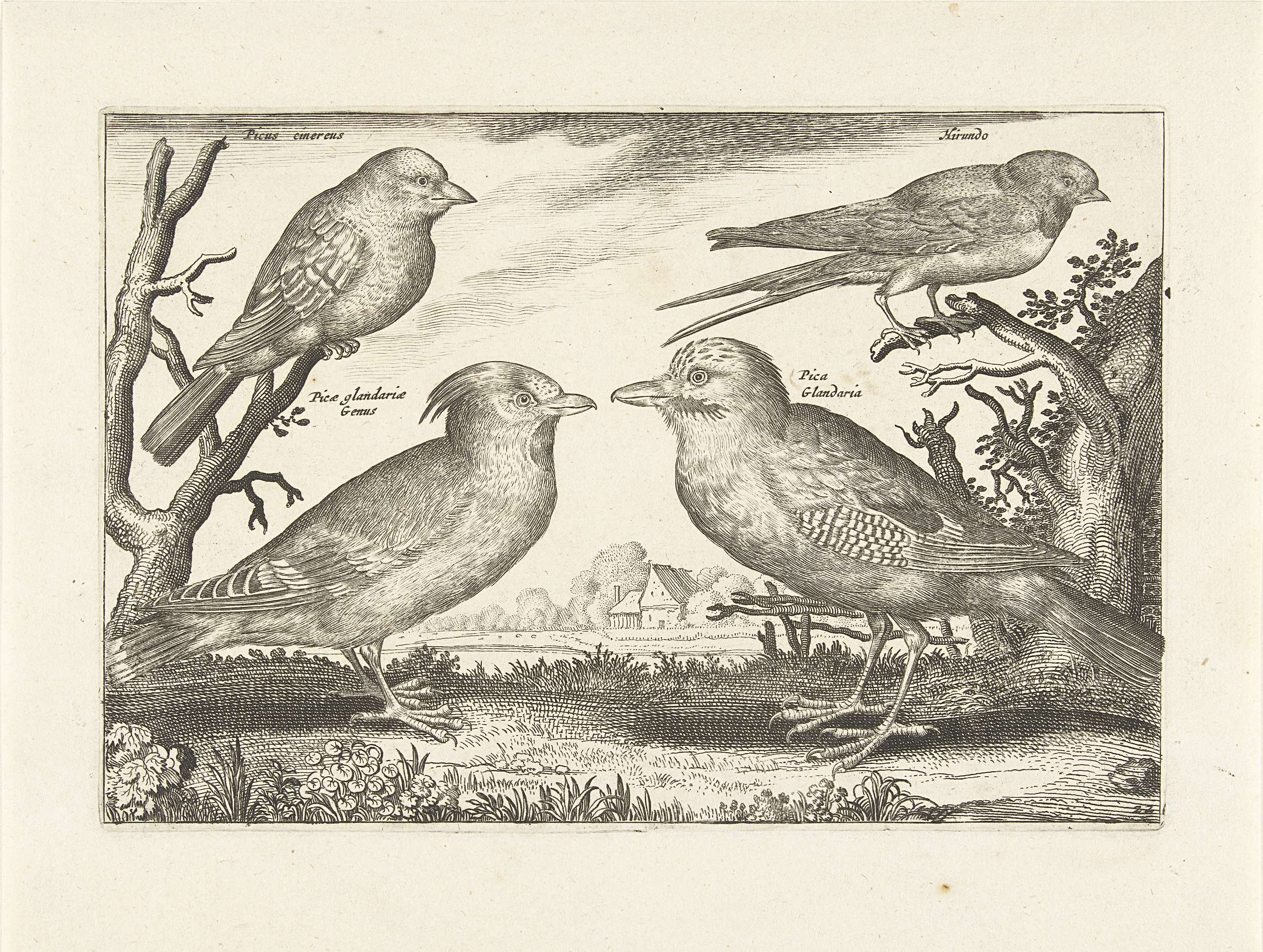 Een Vlaamse gaai, een pestvogel, een vink en een zwaluw. De prent maakt deel uit van een serie met vogels als onderwerp.