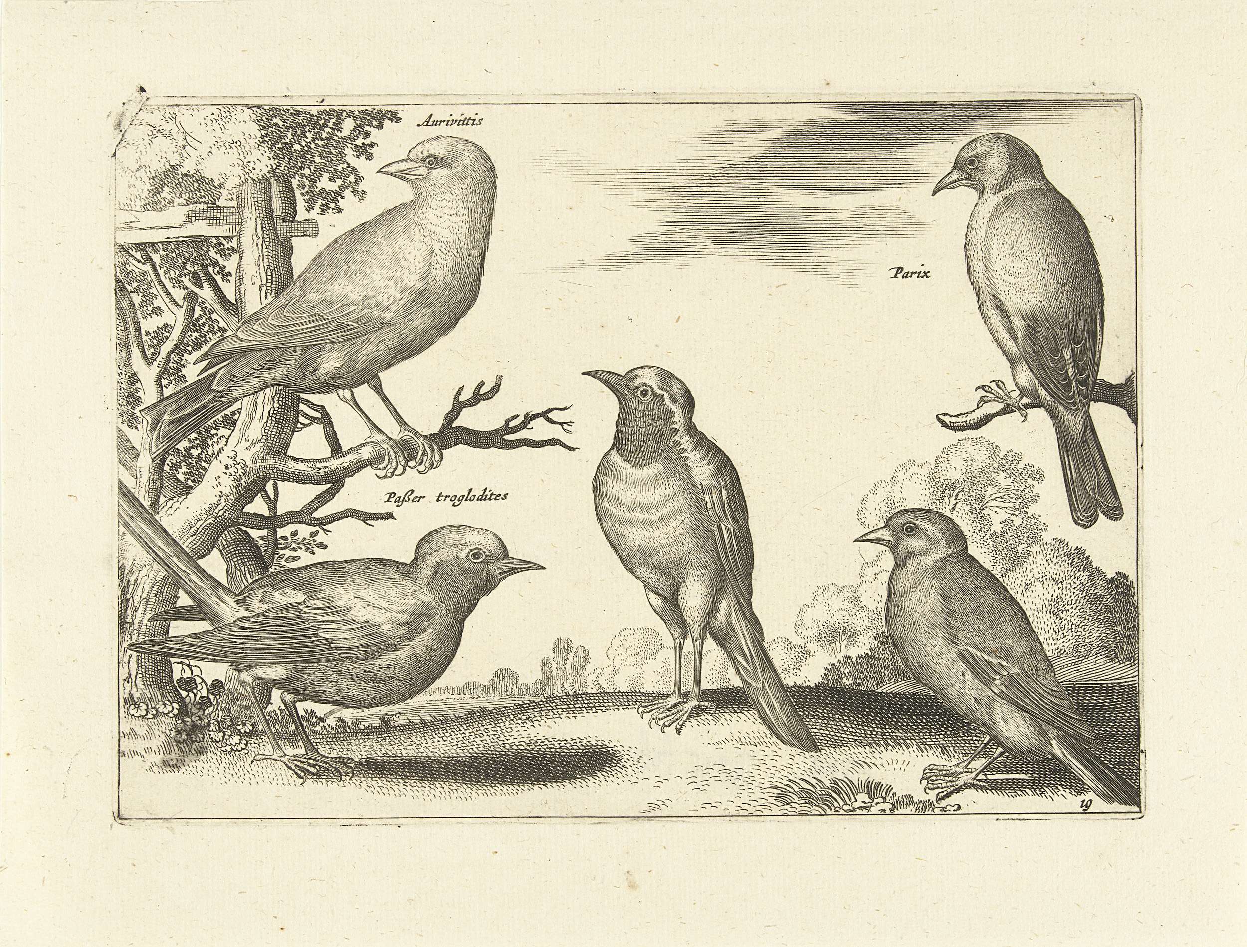 Twee roodstaartje, een mus, een kwikstaartje en een vink. De prent maakt deel uit van een serie met vogels als onderwerp.