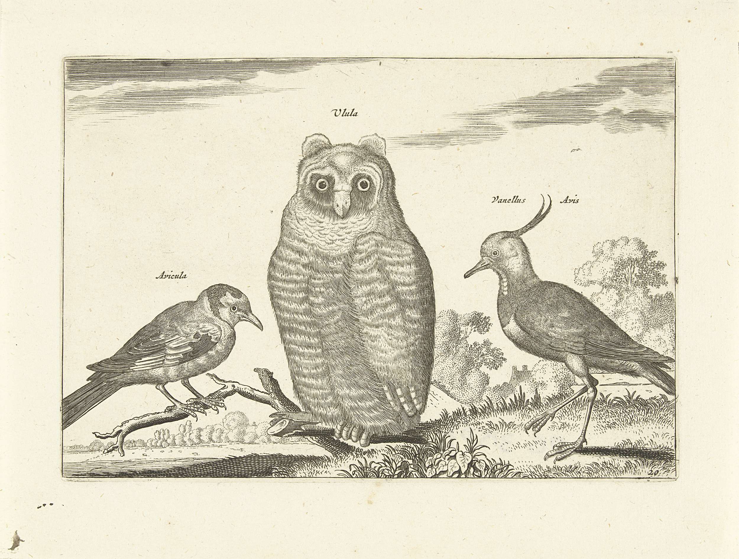 Een uil,een kievit en een vink. De prent maakt deel uit van een serie met vogels als onderwerp.
