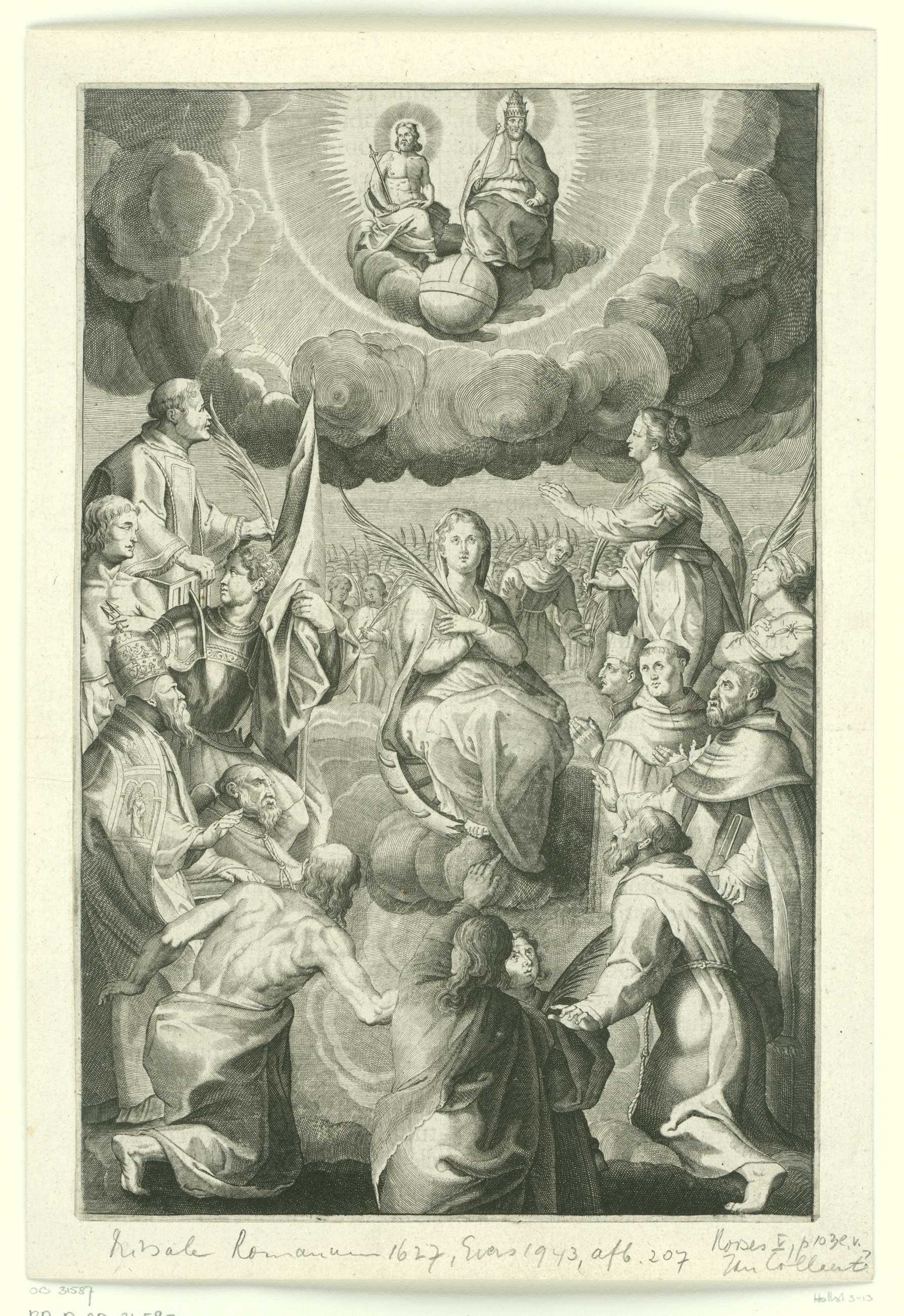 De H. Catharina zit op een gebroken rad op de wolken. Om haar heen heiligen, de paus (links), monniken en gewone stervelingen. Bovenaan in het midden God de Vader en Christus op wereldbol.