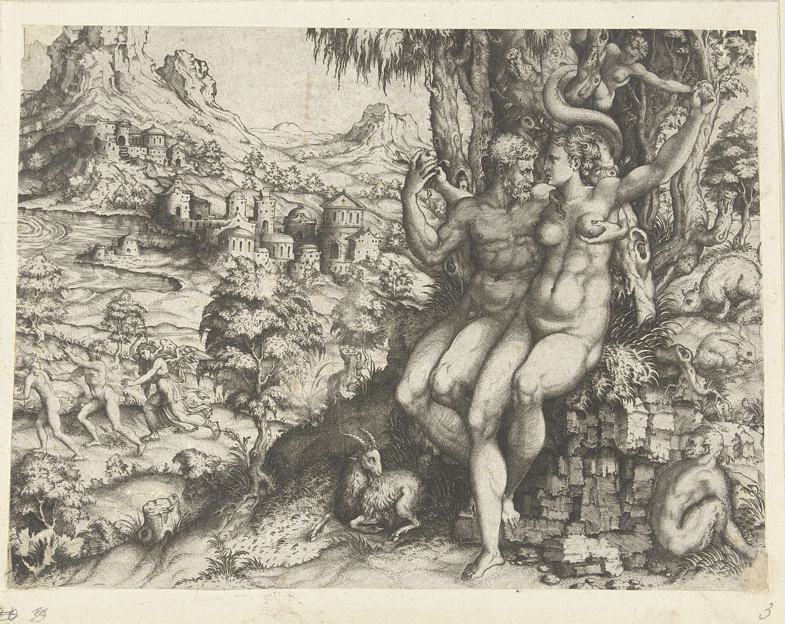 Adam en Eva zitten onder de boom der kennis. Eva neemt de appel aan van de slang en geeft een appel aan Adam. Verschillende dieren zitten om hen heen. Linksachter is de verdrijving van het paar uit het paradijs te zien.