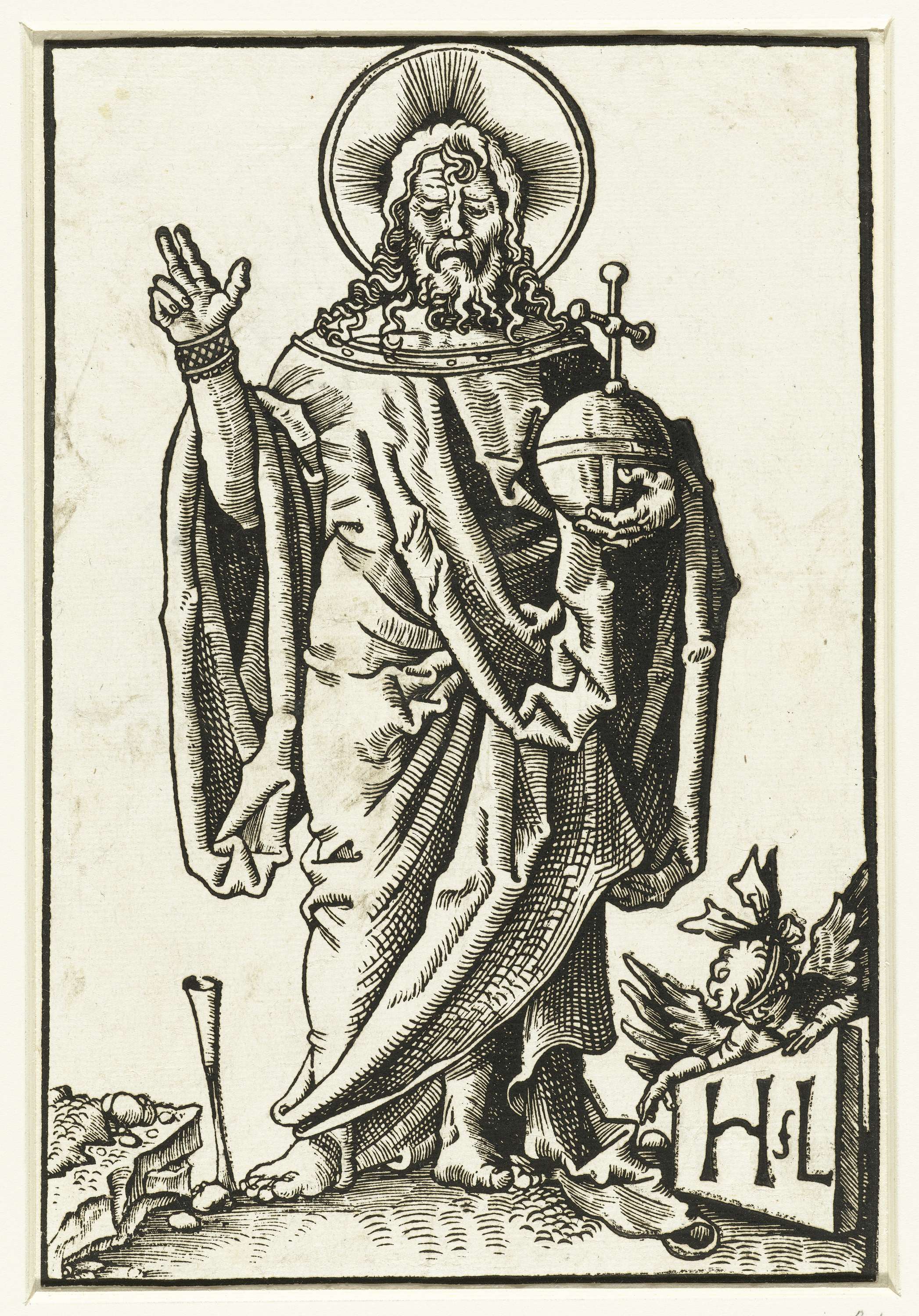 Christus als Salvator Mundi, staand en ten voeten uit. De rijksappel in zijn linkerhand, met zijn rechterhand maakt hij een zegend gebaar. Op de grond een plaat met de signatuur, vastgehouden door een putto met een blinddoek om.
