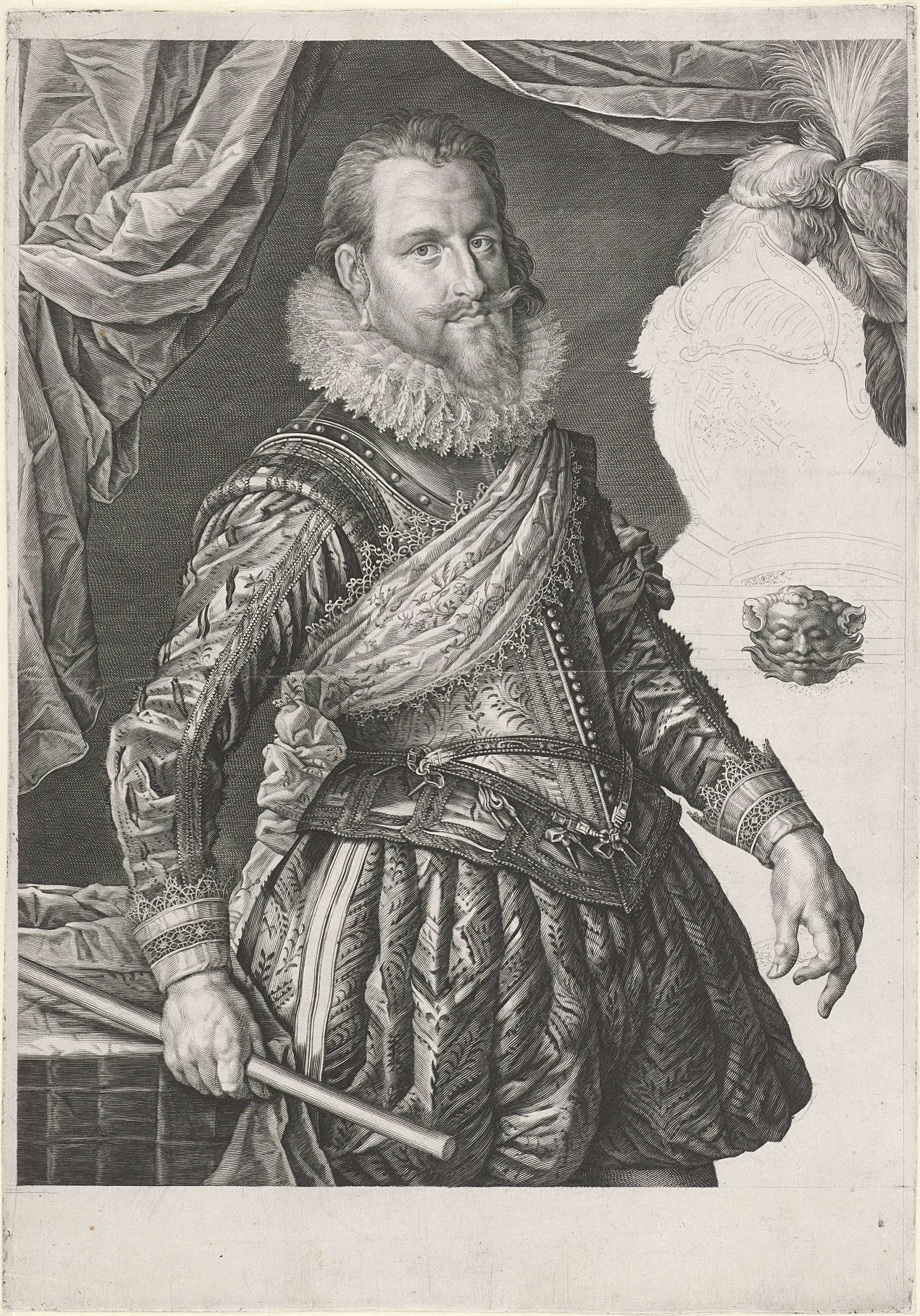 Portret van Christiaan IV, koning van Denemarken en Noorwegen, met een sjerp over de schouder en een bevelhebbersstaf in zijn hand, staande onder een open gordijn.
