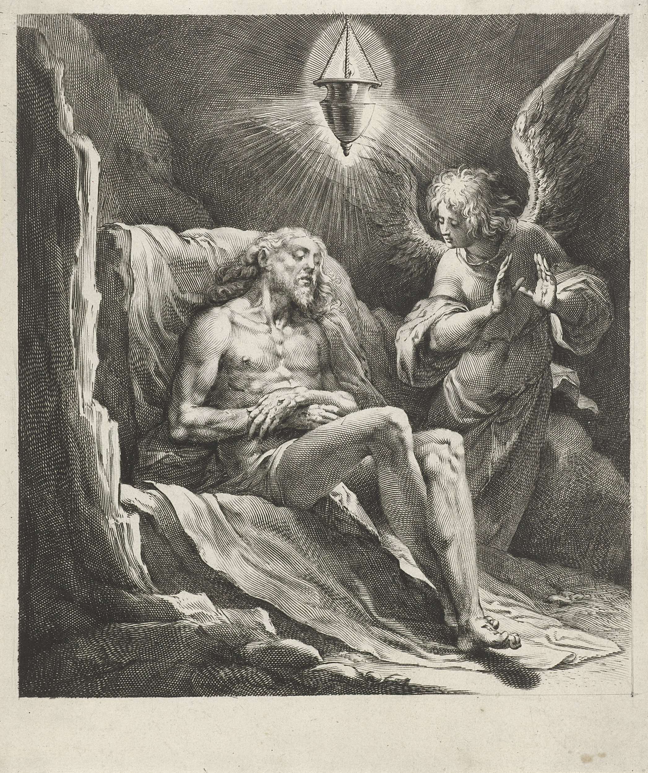 Een engel treurt bij de dode Christus. Het tafereel wordt beschenen door een lantaarn.