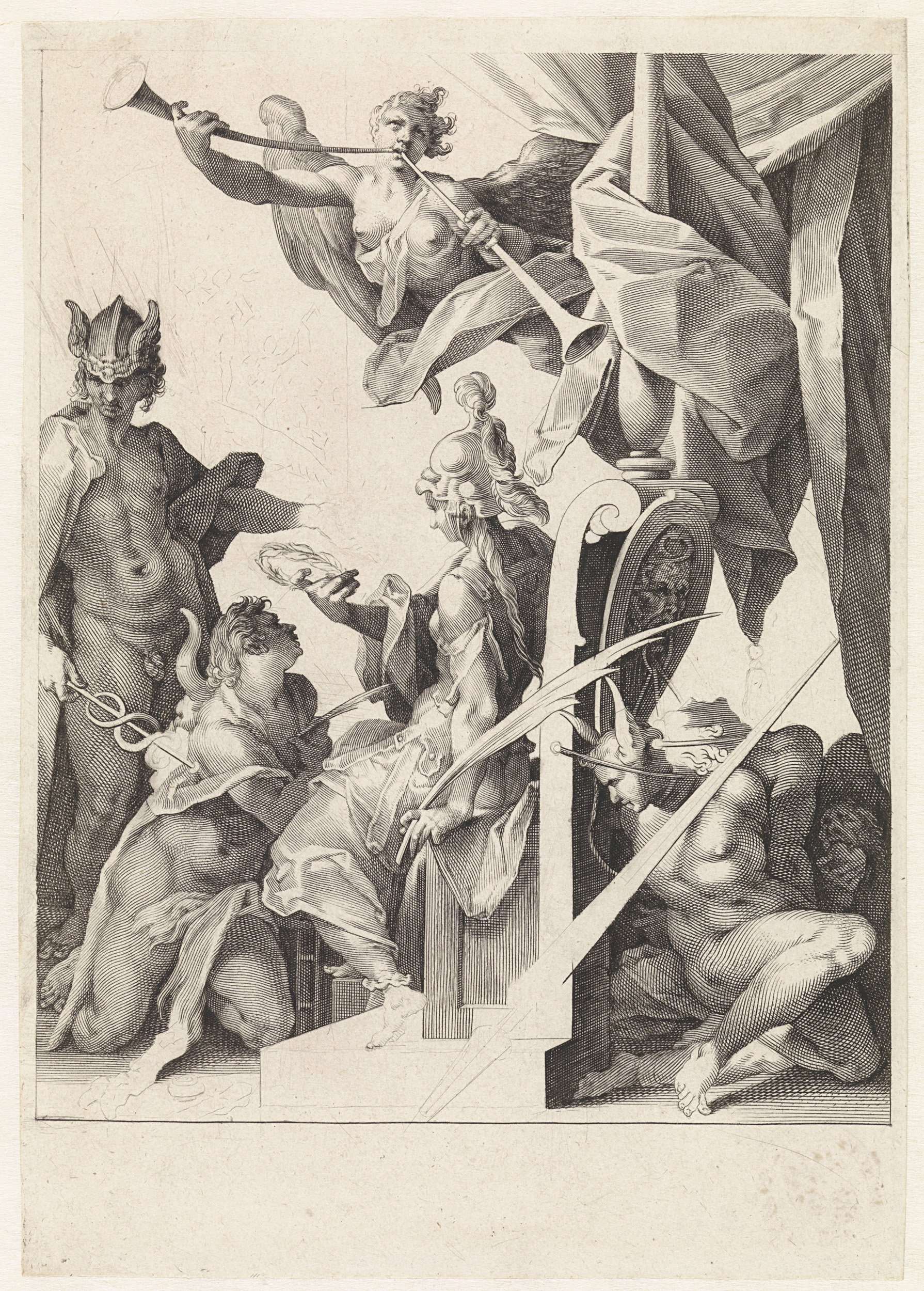 Mercurius presenteert een jonge kunstenaar aan Minerva, die hem met een lauwerkrans kroont. Boven de troon blaast Faam de trompet. Achter de troon zitten de vastgebonden Nijd, Luiheid en Ondeugd.