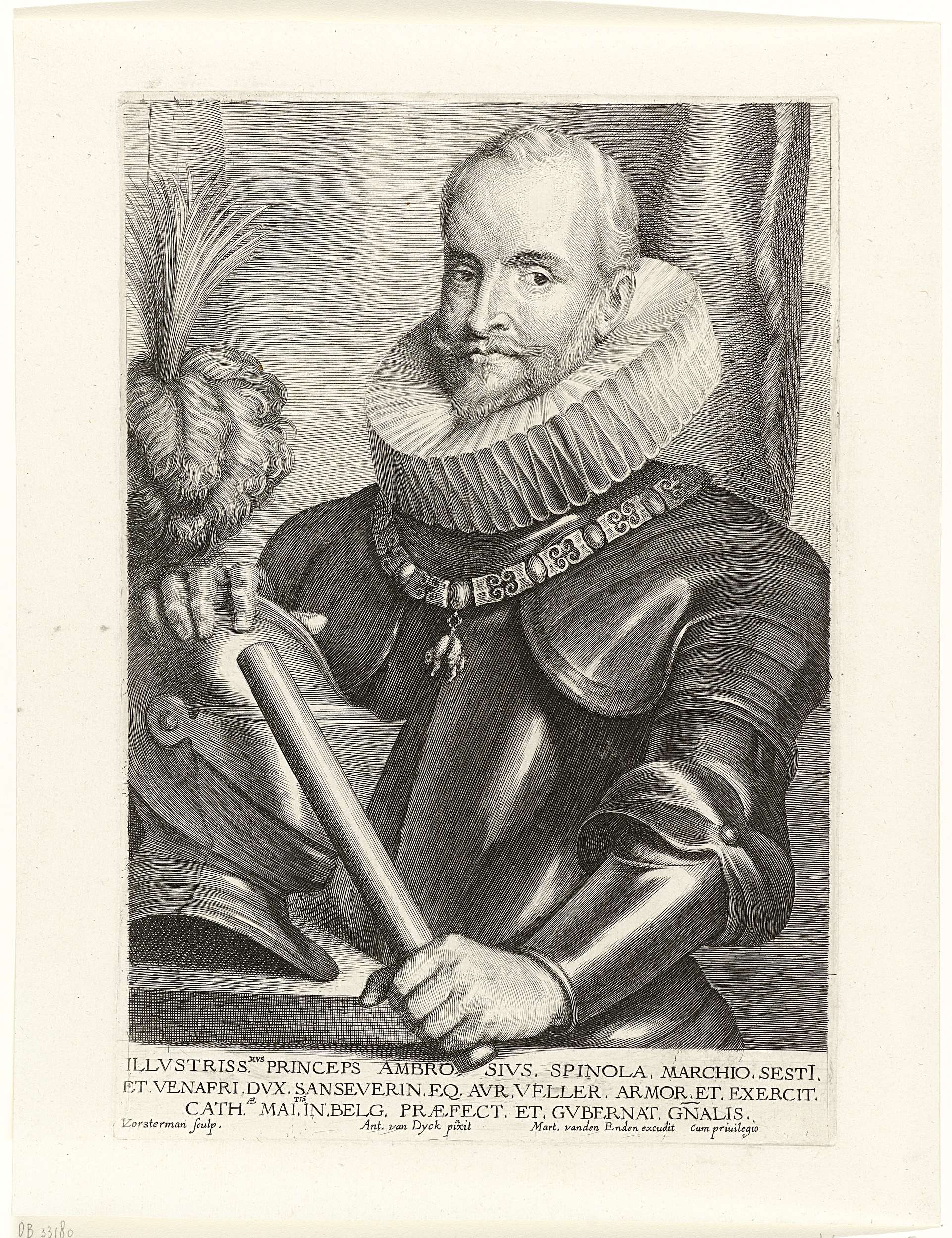 Portret van Ambrogio Spinola, markies de los Balbases, opperbevelhebber van de Spaanse troepen in de Zuidelijke Nederlanden. Zijn rechterhand rustend op helm, commandostaf in linkerhand. Om zijn hals een ketting met het teken van de Orde van het Gulden Vlies.