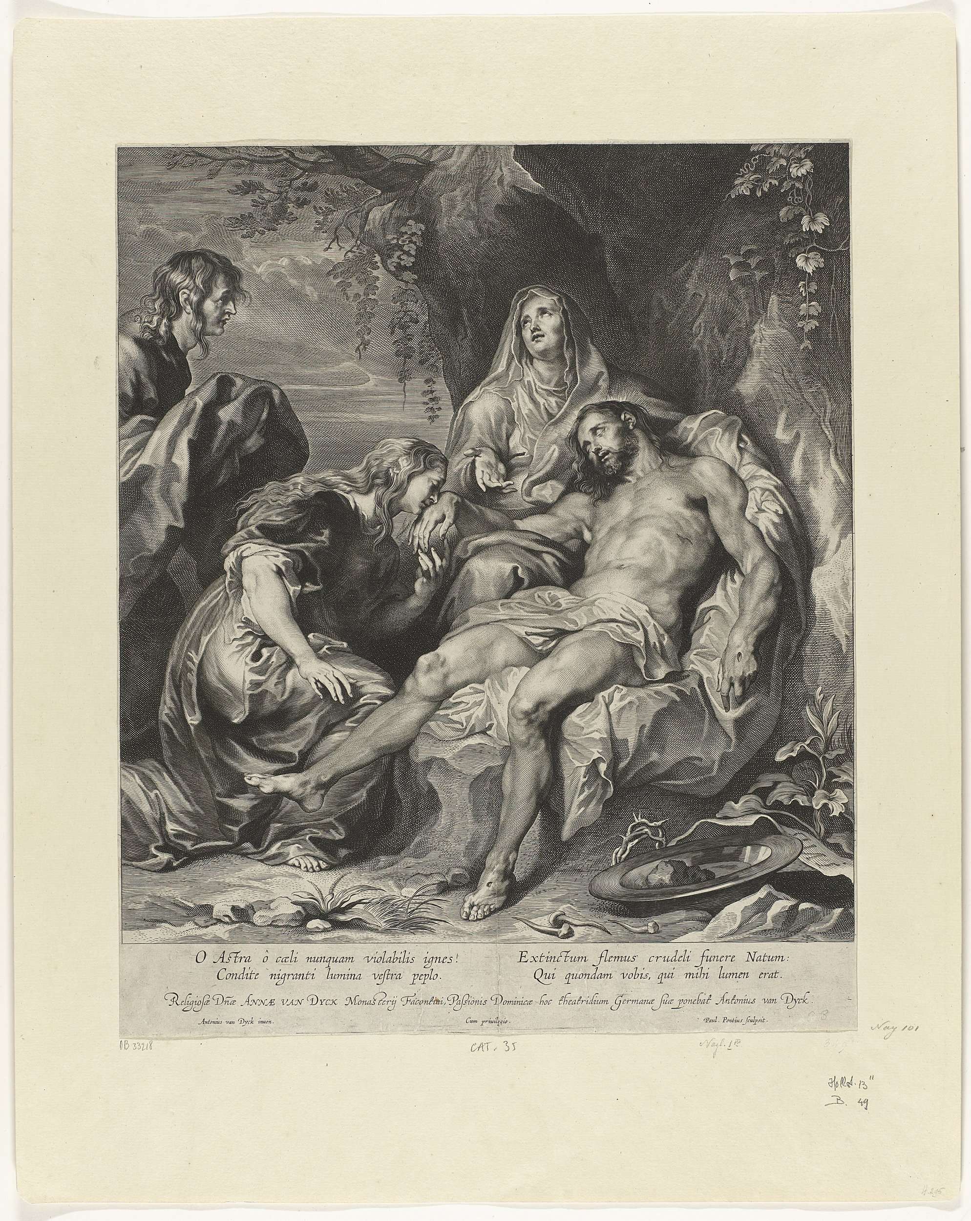 Maria, Maria Magdalena en Johannes de Evangelist treuren bij het lichaam van Christus. Aan Christus' voeten liggen de doornenkroon en de spijkers. In de marge een vierregelig onderschrift, in twee kolommen, in het Latijn. Daaronder een opdracht in het Latijn.
