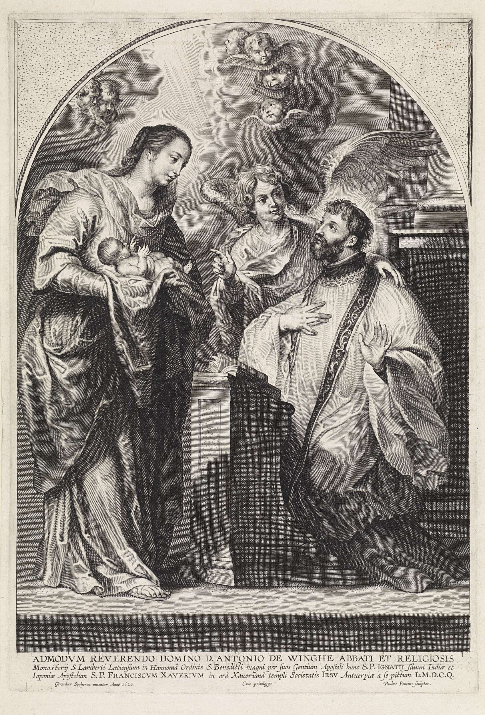 De Heilige Franciscus Xaverius knielt voor zijn lessenaar. Naast hem een engel die naar het Christuskind wijst. Maria staat voor de lessenaar en toont hen het Christuskind. Vanuit de hemel straalt een goddelijk licht op hen neer. In de marge een drieregelig onderschrift met een opdracht in Latijn.