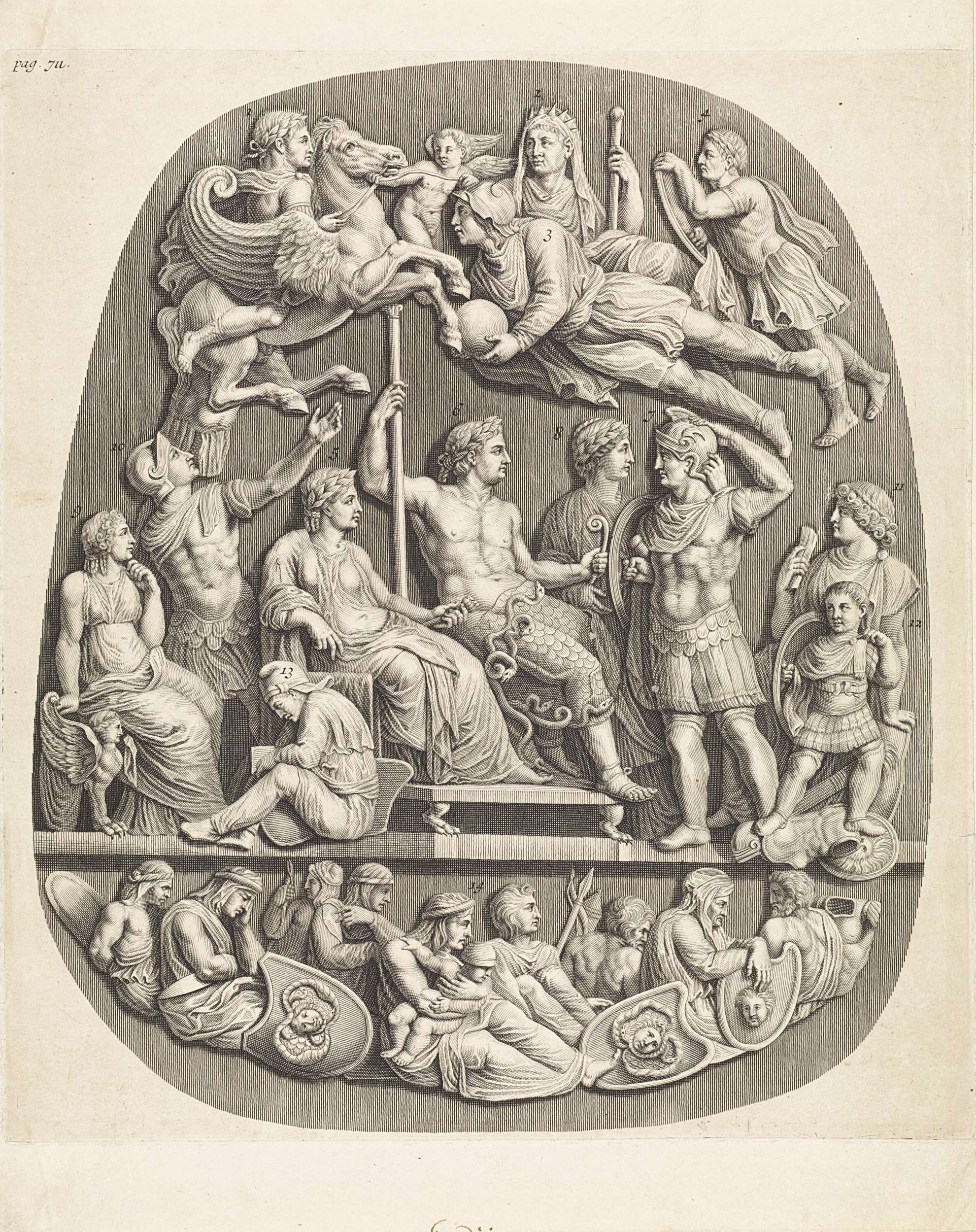 Een camee (Gemma Tiberiana) met een voorstelling van de verheerlijking van Germanicus. Keizer Tiberius en zijn moeder Livia zitten op een troon. De Romeinse veldheer Germanicus neemt afscheid van hen. Boven hen stijgen de lichamen van overledenen op naar de hemel. Onder hen een groep barbaren die door de Romeinen gevangen zijn genomen. De figuren ...
