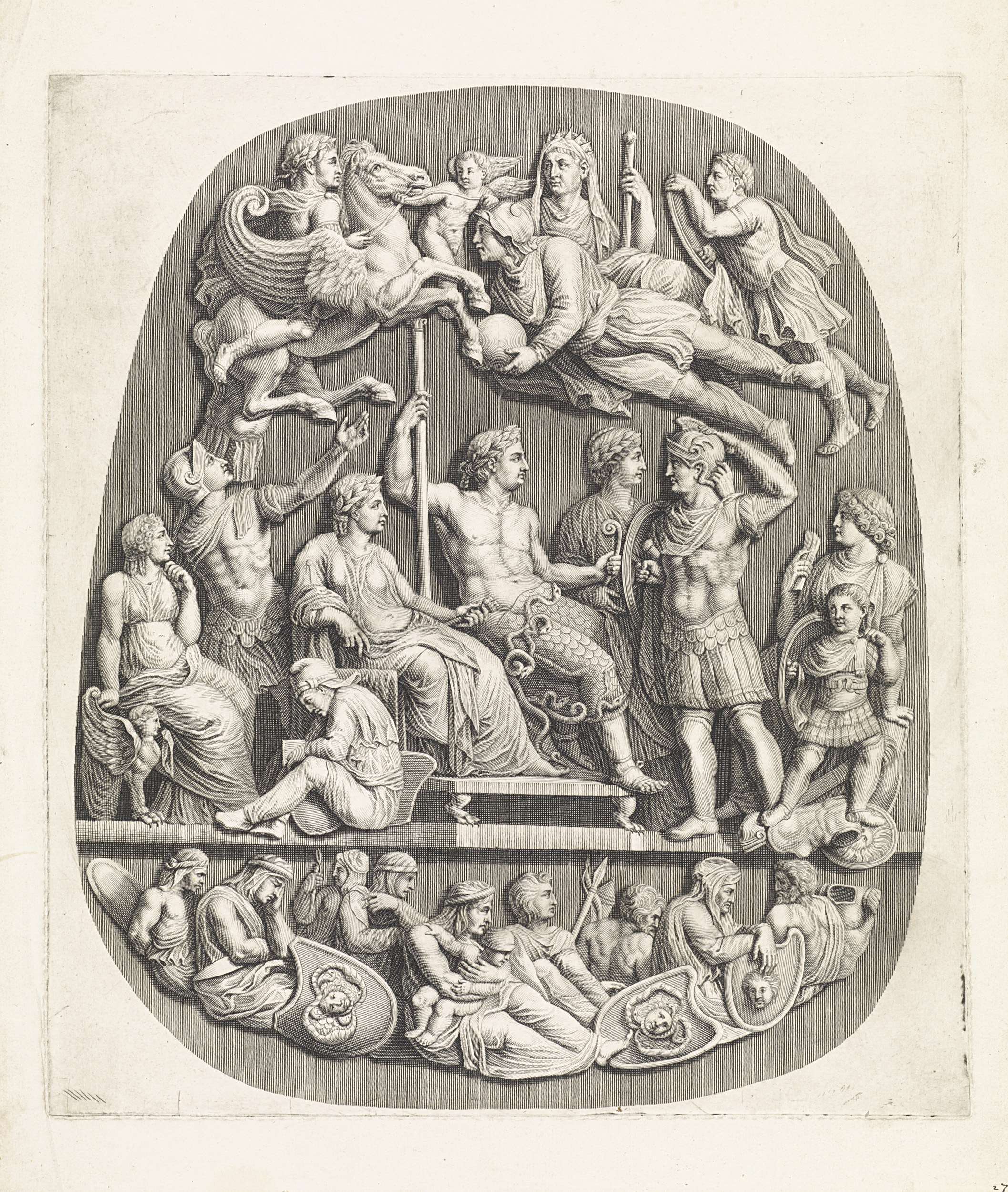 Een camee (Gemma Tiberiana) met een voorstelling van de verheerlijking van Germanicus. Keizer Tiberius en zijn moeder Livia zitten op een troon. De Romeinse veldheer Germanicus neemt afscheid van hen. Boven hen stijgen de lichamen van overledenen op naar de hemel. Onder hen een groep barbaren die door de Romeinen gevangen zijn genomen.