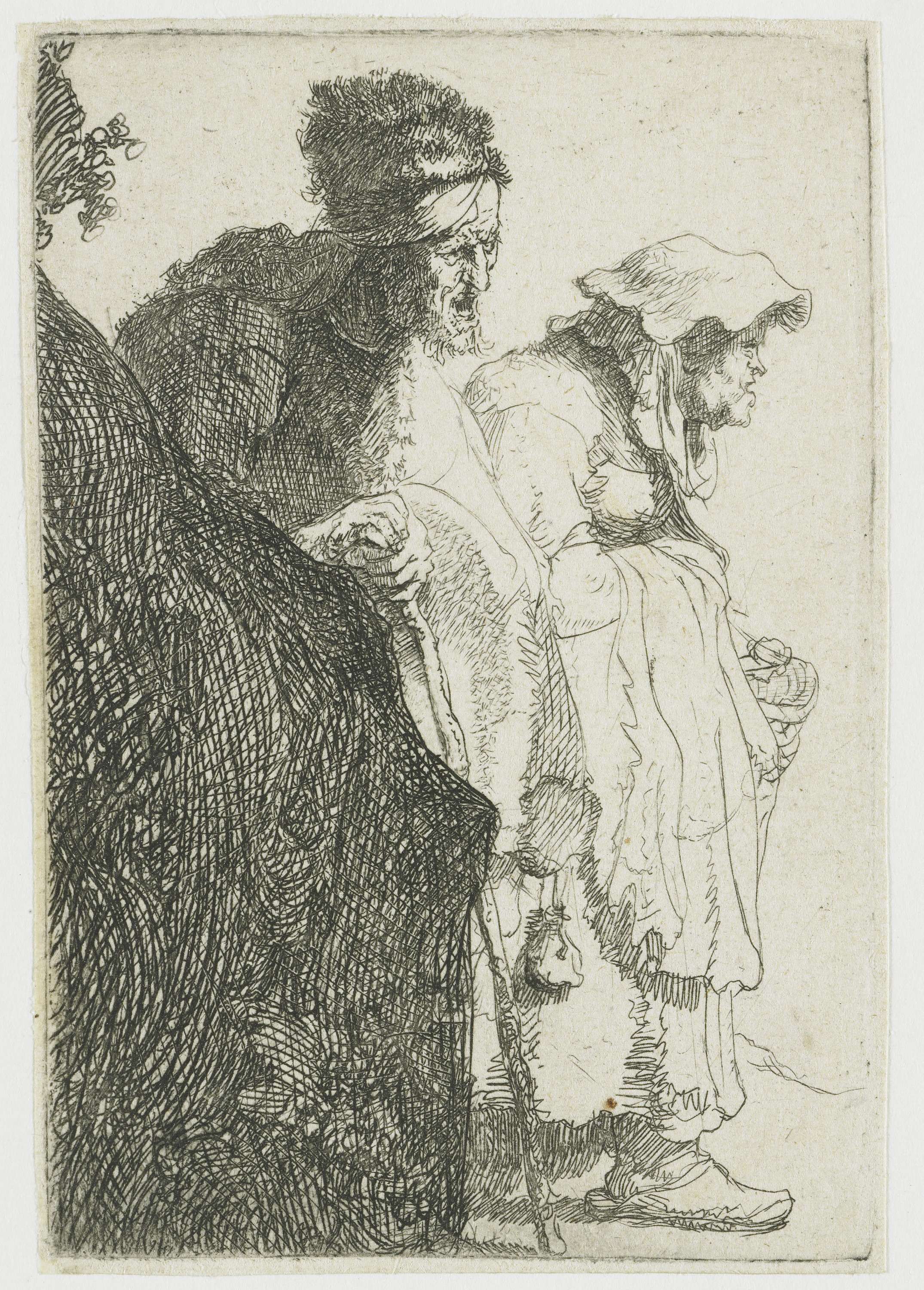 Rembrandt vond veel inspiratie in de figuren die hij buiten tegenkwam. Maar etsen deed hij niet op straat. Zijn prenten voerde hij binnen uit, in zijn werkplaats. Zijn observaties zijn er niet minder raak om. Zowel het bedelaarspaar als de stakker met het houten been lijken luidkeels te roepen, terwijl het boertje in het midden ...