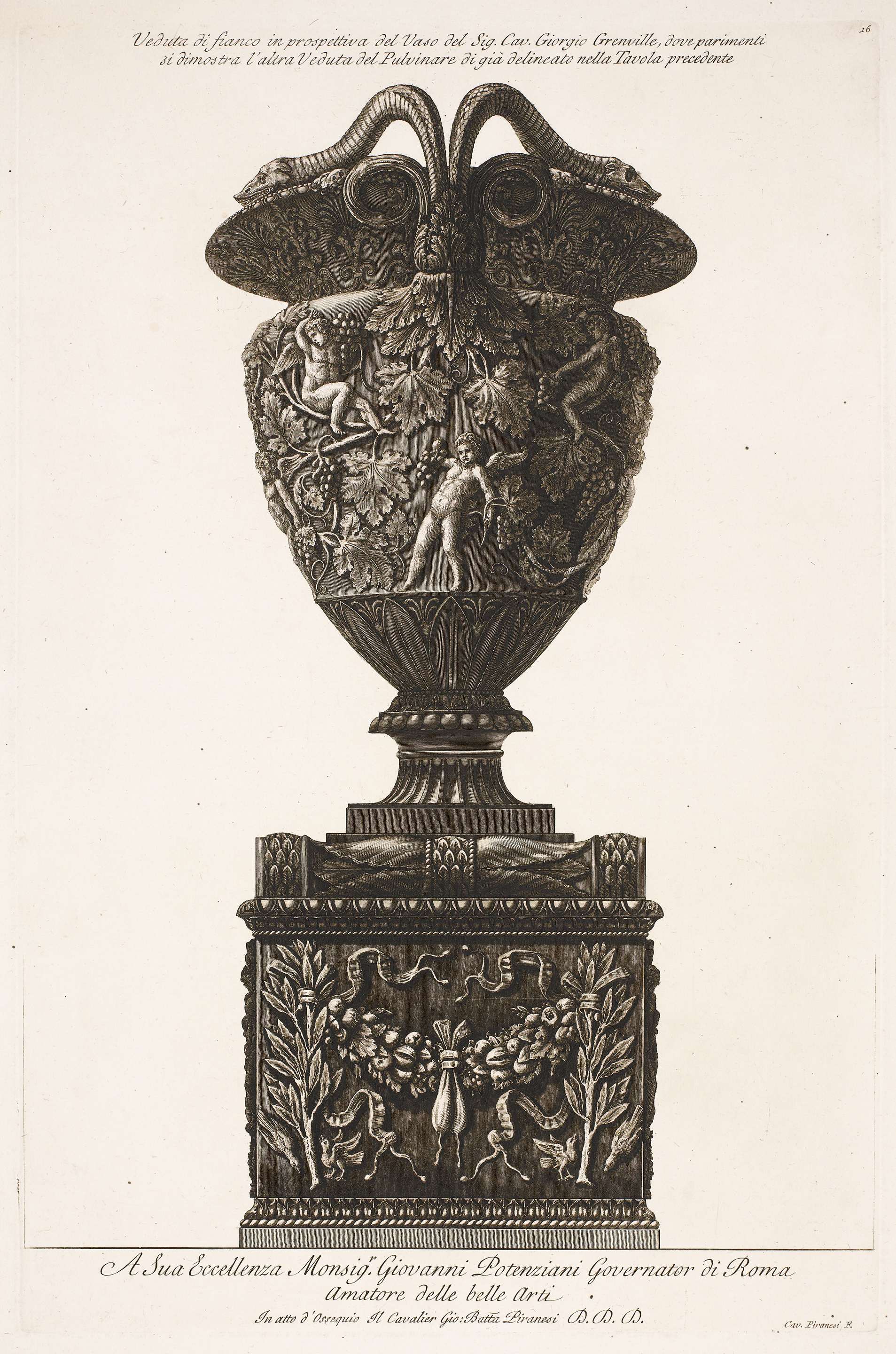 Een vaas met wijnranken en putti, gevonden in de Villa Adriana te Tivoli. Tekst boven voorstelling. Opdracht onder voorstelling. Genummerd rechtsboven: 16.