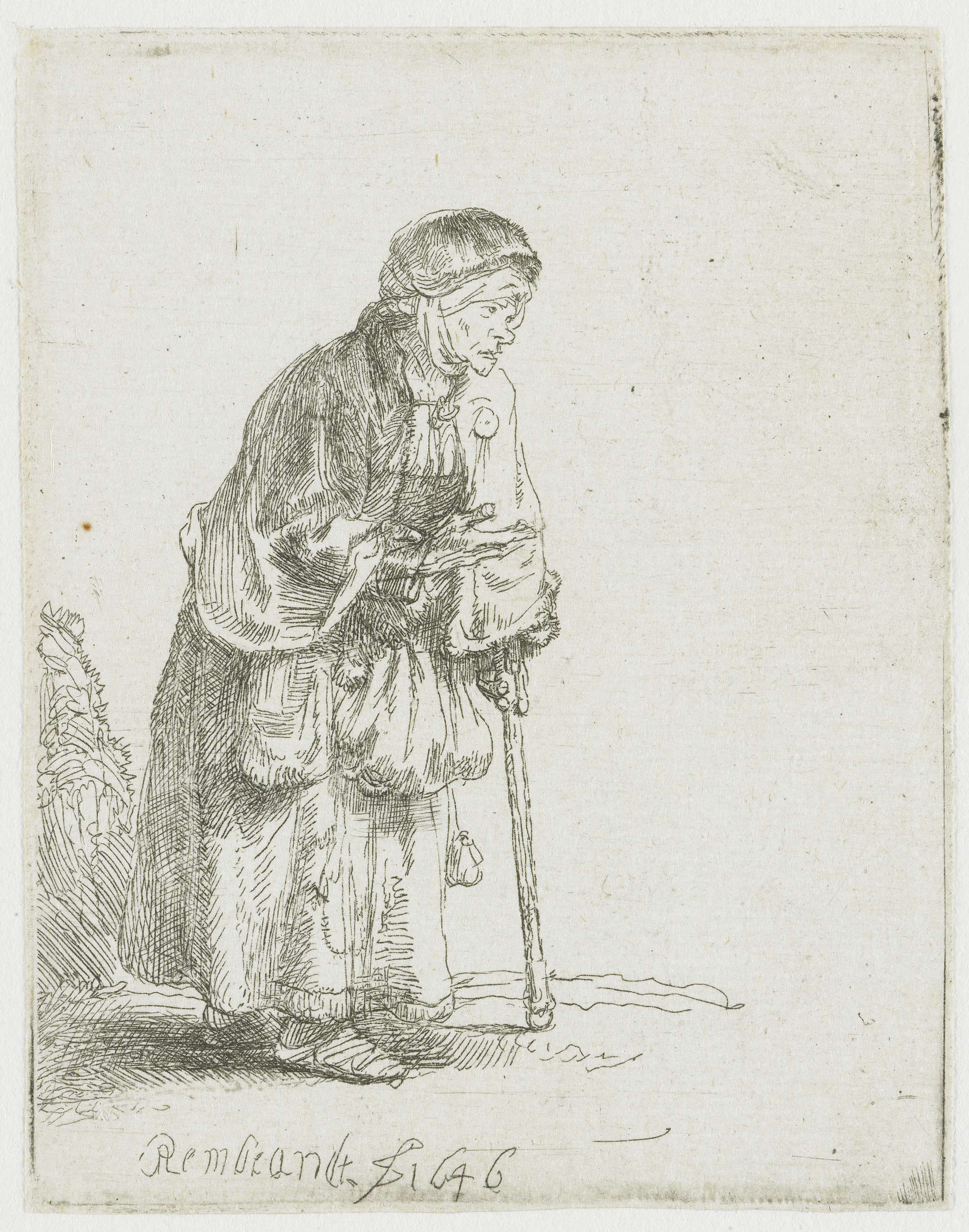 In zijn vroege werk legde Rembrandt onophoudelijk belangstelling aan de dag voor volkse types. Later kwam hij nog hooguit incidenteel op dat onderwerp terug, zoals in deze twee prenten. Ze getuigen nog steeds van zijn meesterschap. Met wat rake lijnen typeert hij de peuter links, die zo te zien alleen met zijn familie meeloopt omdat ...