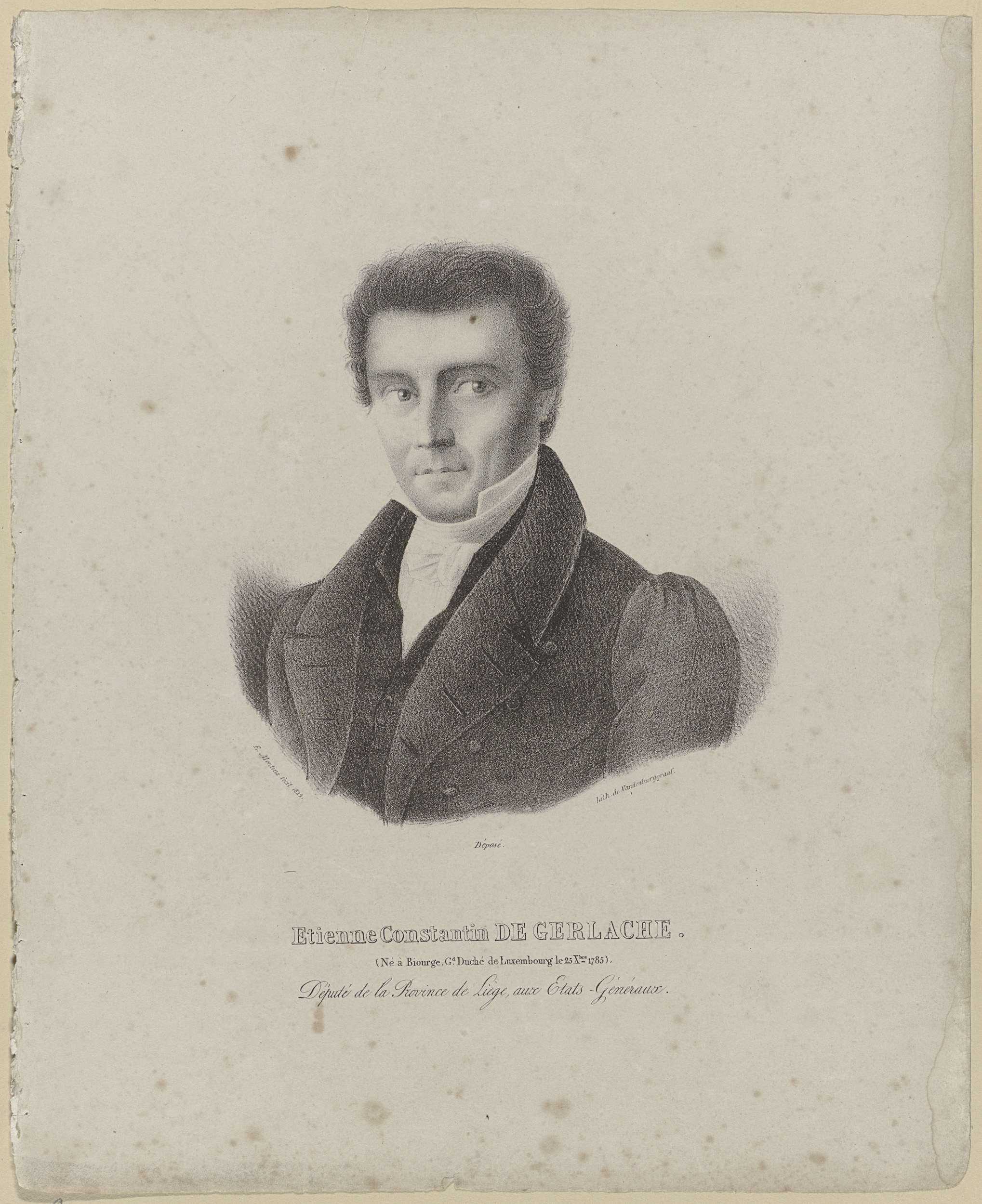 Portret van Etienne baron De Gerlache, afgevaardide namens de provincie Luik in de Staten-Generaal, ca. 1830. Onderdeel van een groep portretten van personen die aan de Belgische Revolutie hebben deelgenomen of daardoor vermaard zijn.