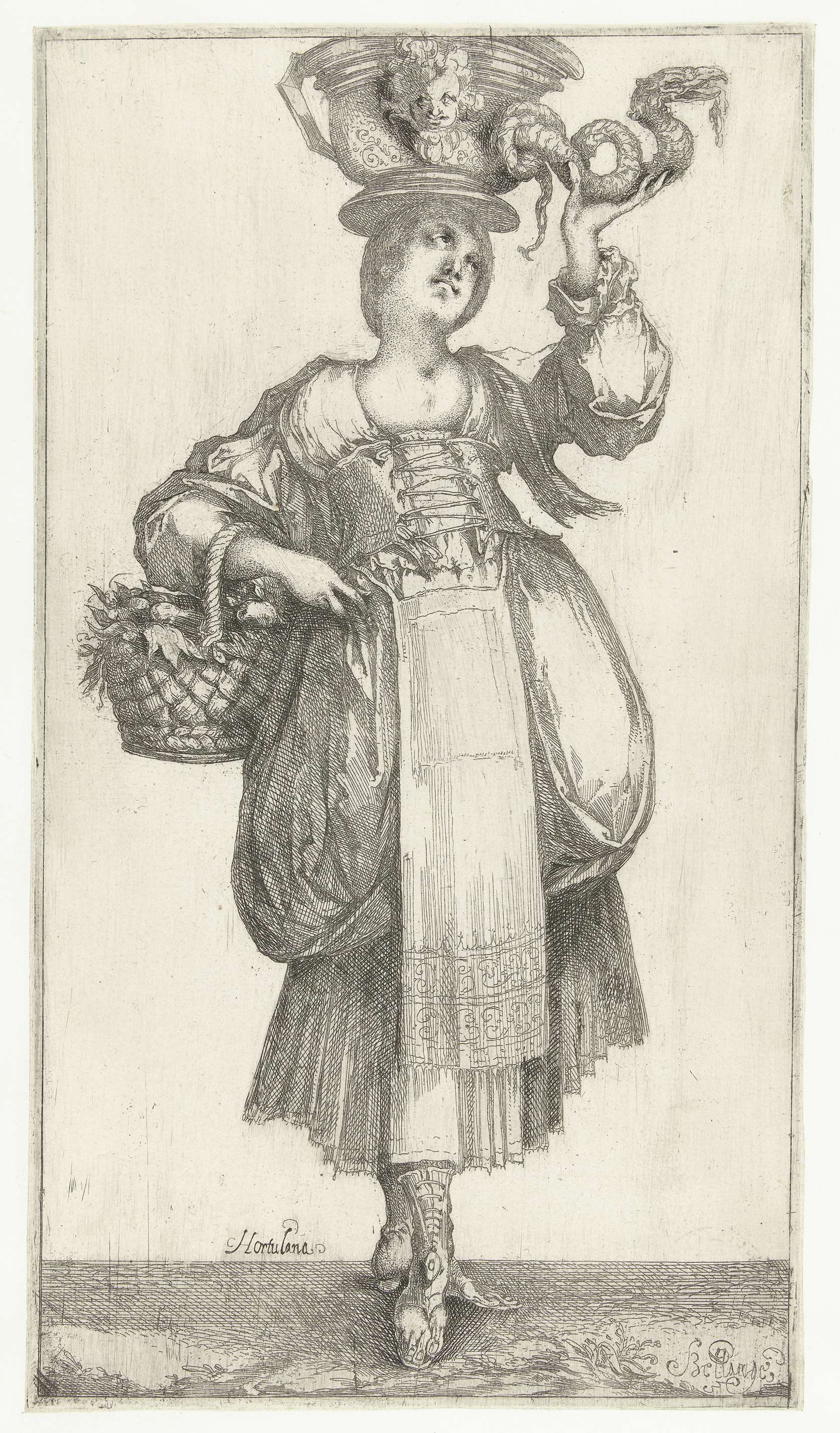 Jonge vrouw met een mand aan haar arm en zij draagt een gedecoreerde schaal op haar hoofd. Uit een serie van vier prenten met tuiniersters.
