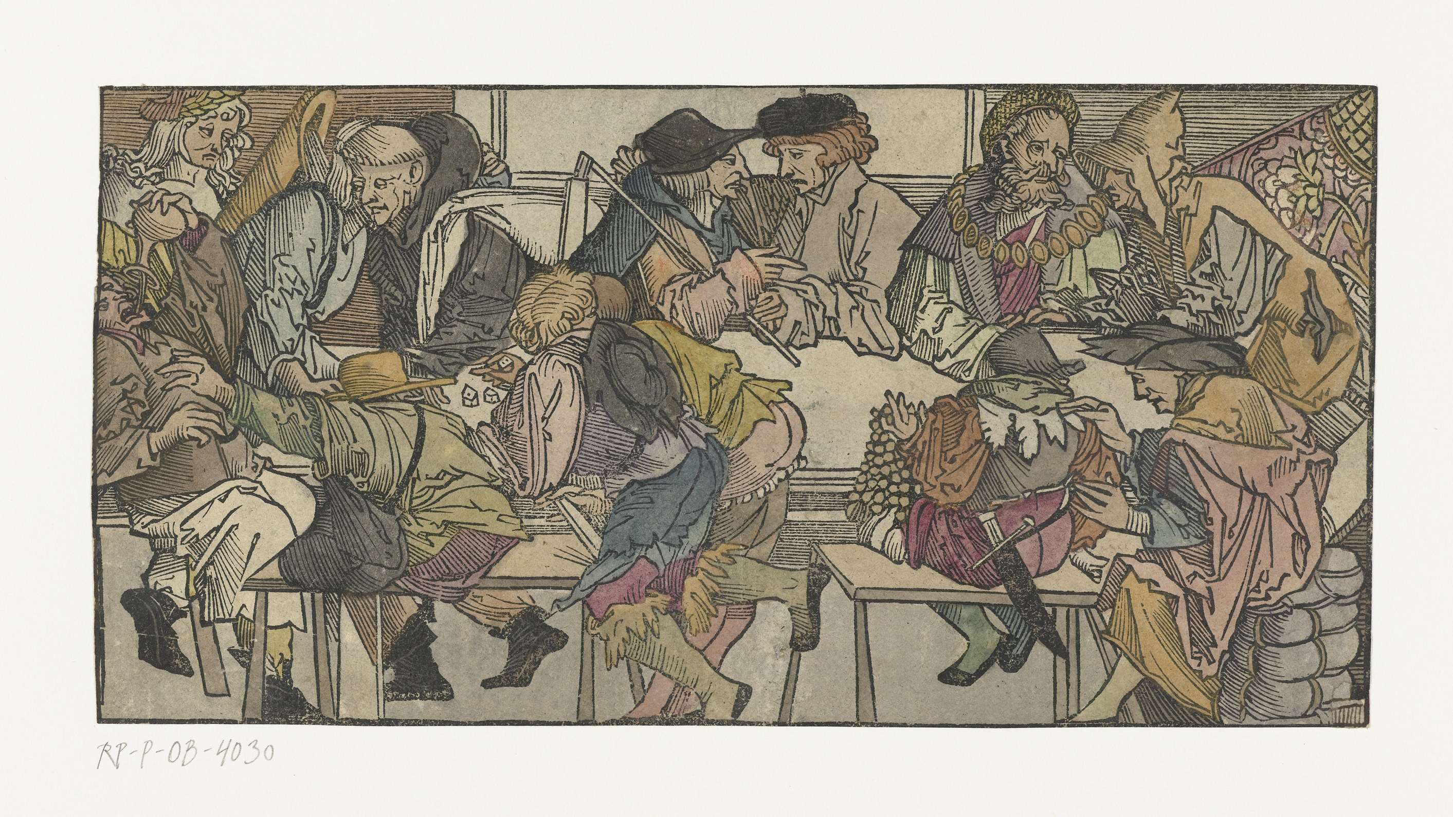 Een bont gezelschap rond een tafel. Geheel links een man die drank in zijn mond giet. Een monnik wordt iets ingefluisterd, daarachter staat een man met lange haren en een lauwerkrans. Naast de monnik zijn twee mannen in gesprek, één draagt gereedschap over zijn schouder. Daarnaast zitten twee mannen waarvan één in luxe kledij en ...