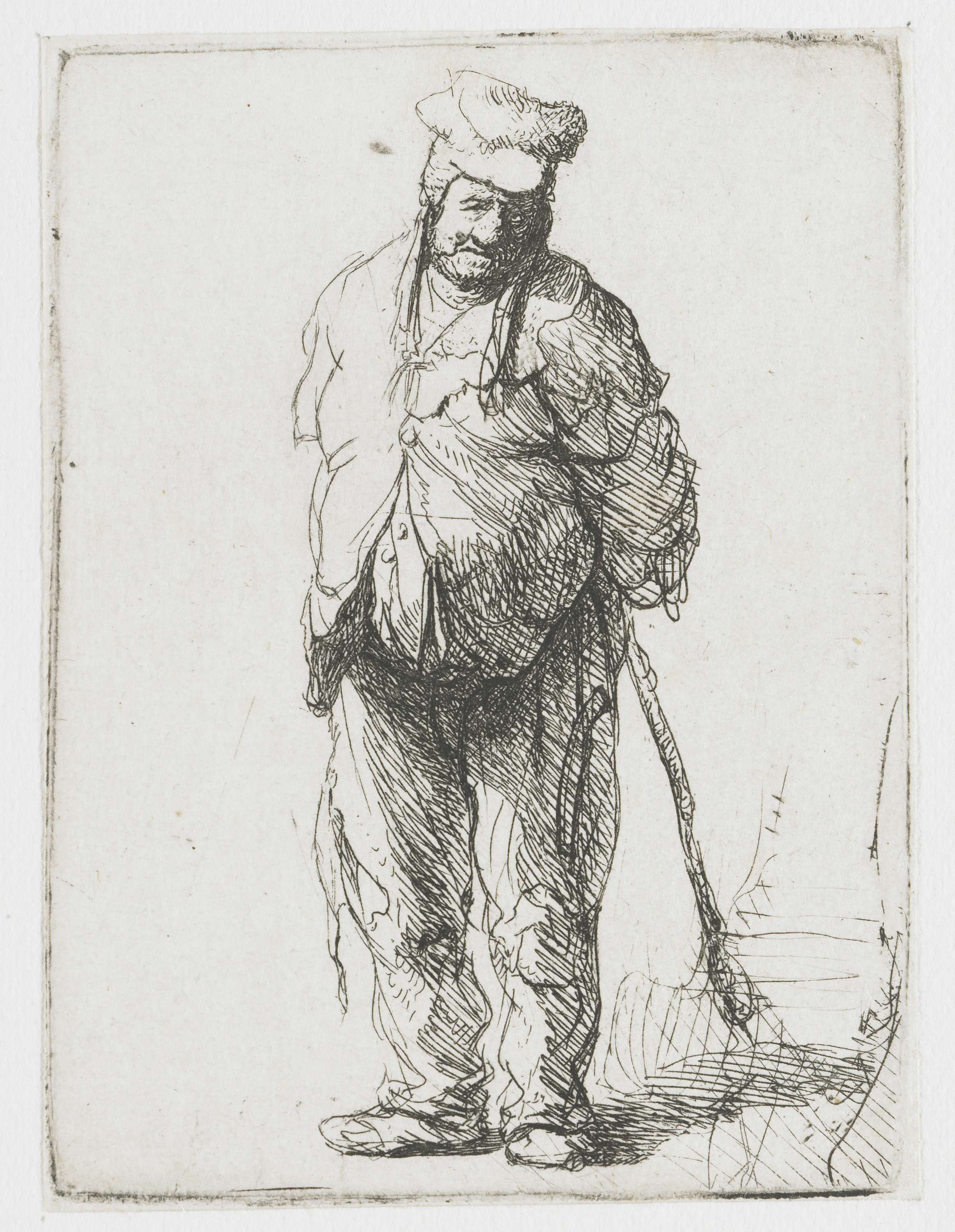 Rembrandt vond veel inspiratie in de figuren die hij buiten tegenkwam. Maar etsen deed hij niet op straat. Zijn prenten voerde hij binnen uit, in zijn werkplaats. Zijn observaties zijn er niet minder raak om. Zowel het bedelaarspaar als de stakker met het houten been lijken luidkeels te roepen, terwijl het boertje in het midden ...