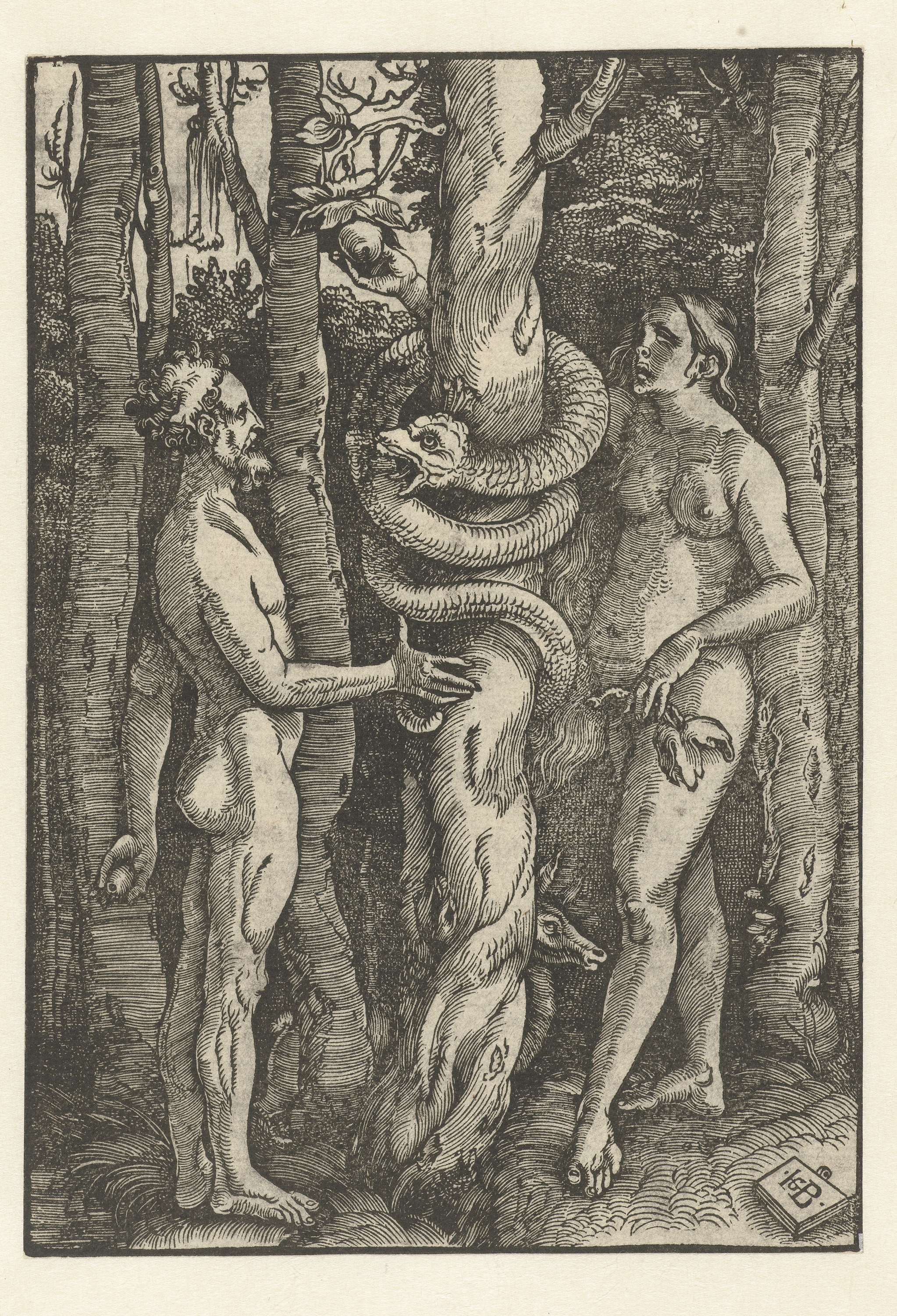 Adam en Eva staan naakt aan weerszijden van een boom in het paradijs. De slang kronkelt zich rond de stam van de appelboom. Eva plukt een appel van een tak. Op de achtergrond tussen de bomen staat een hinde.