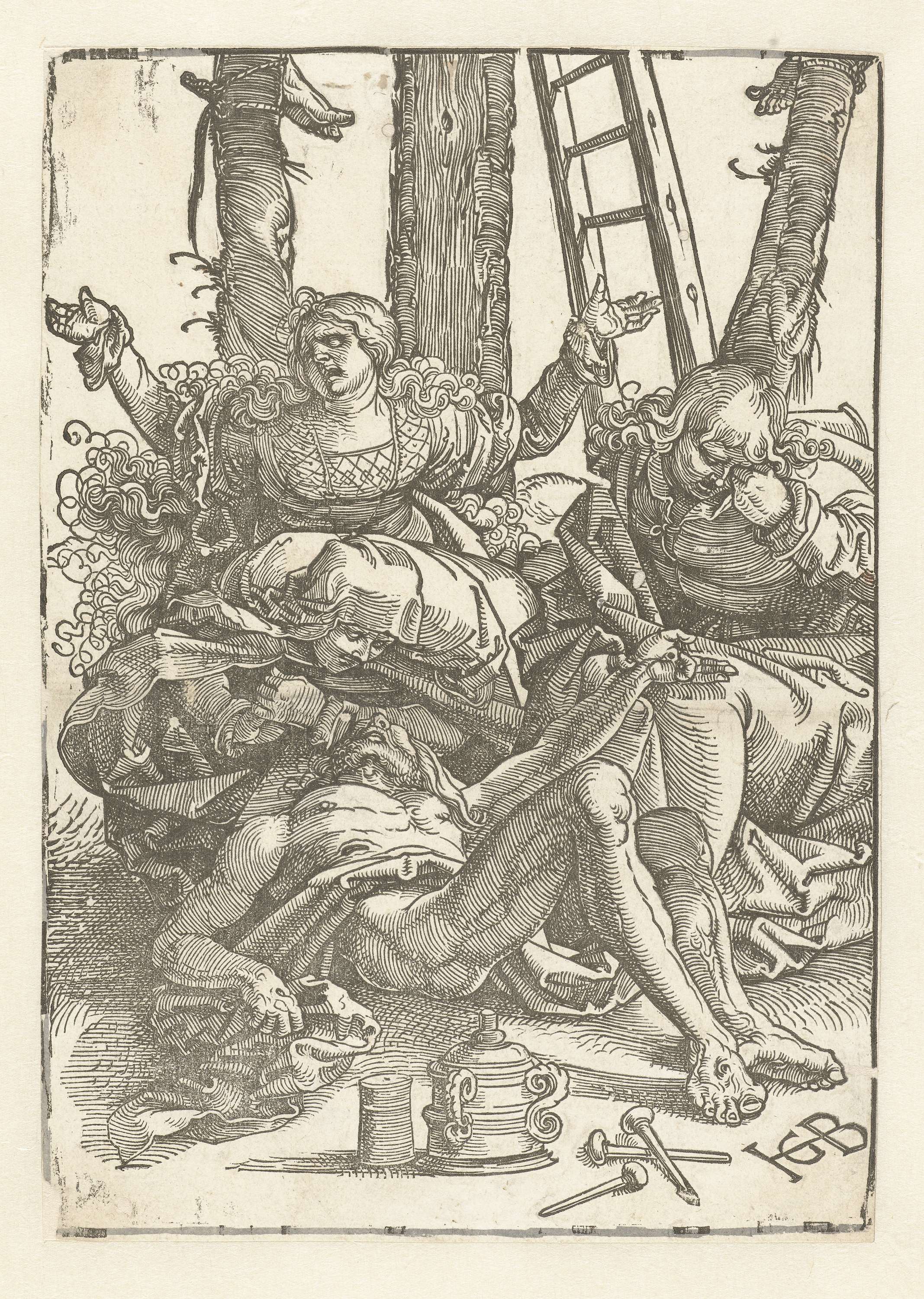 Het dode lichaam van Christus is van het kruis genomen en ligt aan de voet van het kruis. Maria buigt zich over haar zoon en Johannes zit huilend naast haar. Achter hen heft Maria Magadalena in wanhoop haar armen op. Op de voorgrond liggen nagels en staat een zalfpot.