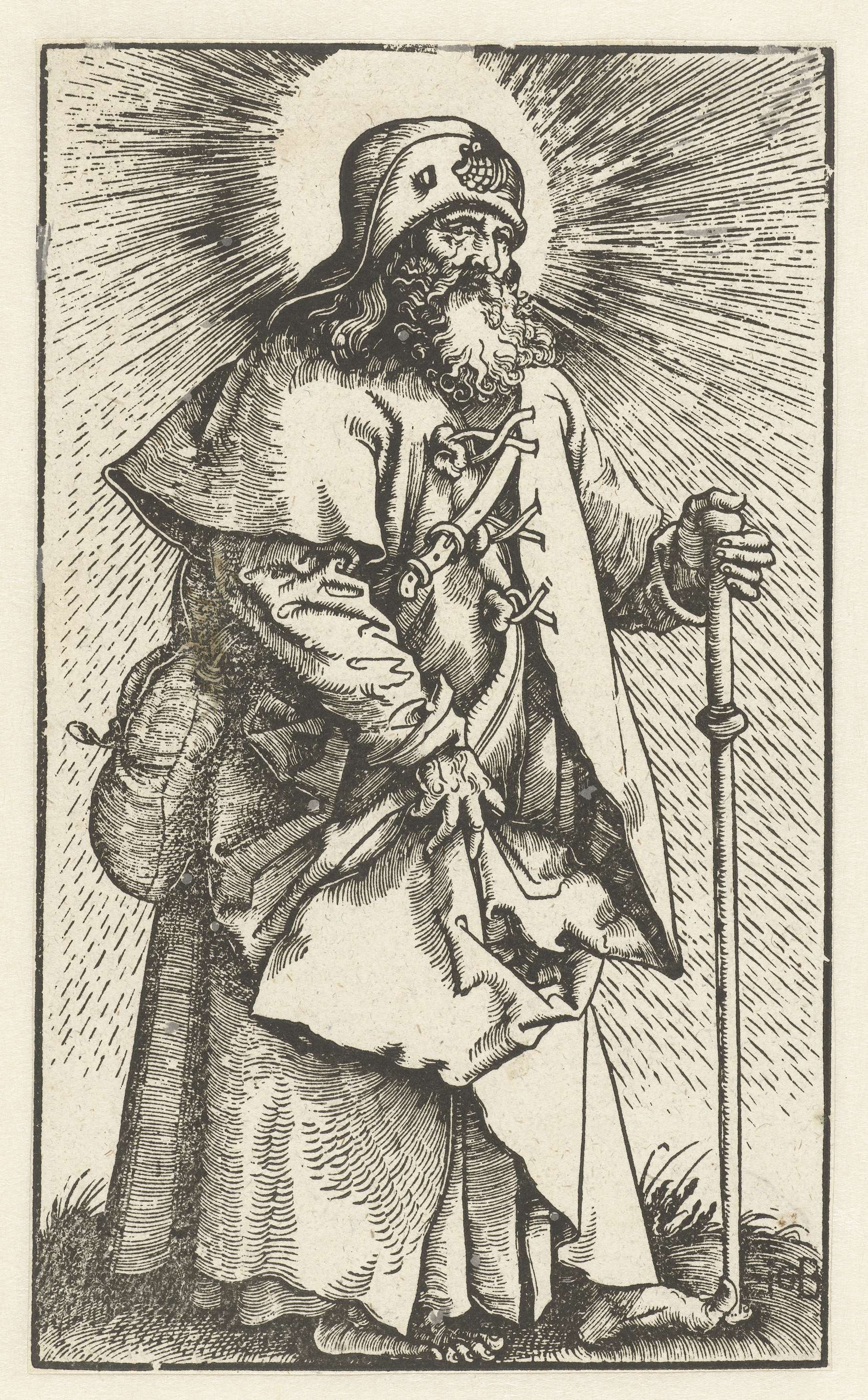 Jakobus de Meerdere gekleed als pelgrim met een mantel, een pelgrimshoed met een Sint-Jakobsschelp en over zijn schouder draagt hij een tas. Ook de pelgrimsstaf in zijn linkerhand is een kenmerkend attribuut van deze heilige.