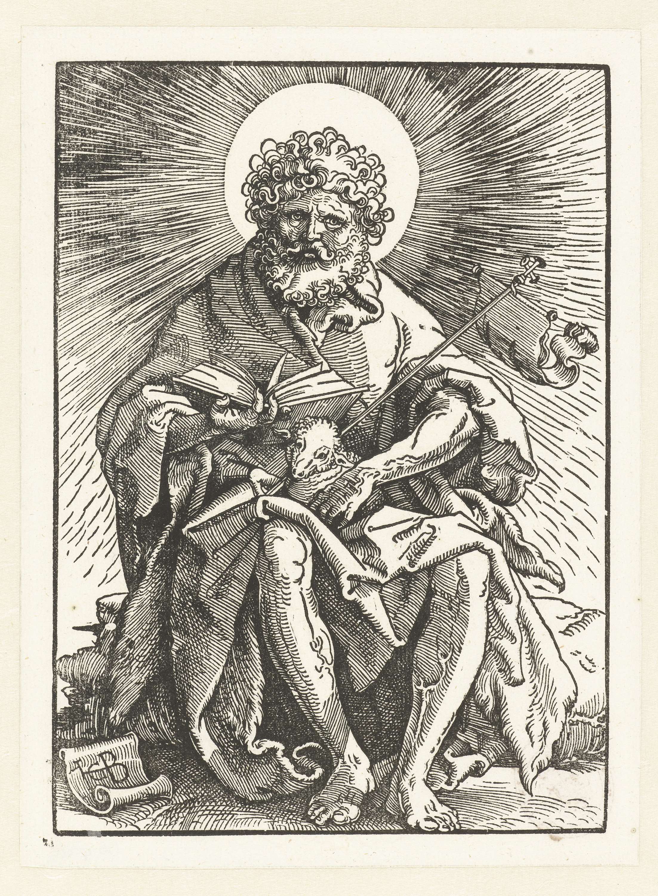 Johannes de Doper zittend met het Lam Gods op zijn schoot. Het Lam draagt met een voorpoot het kruisvaandel.
