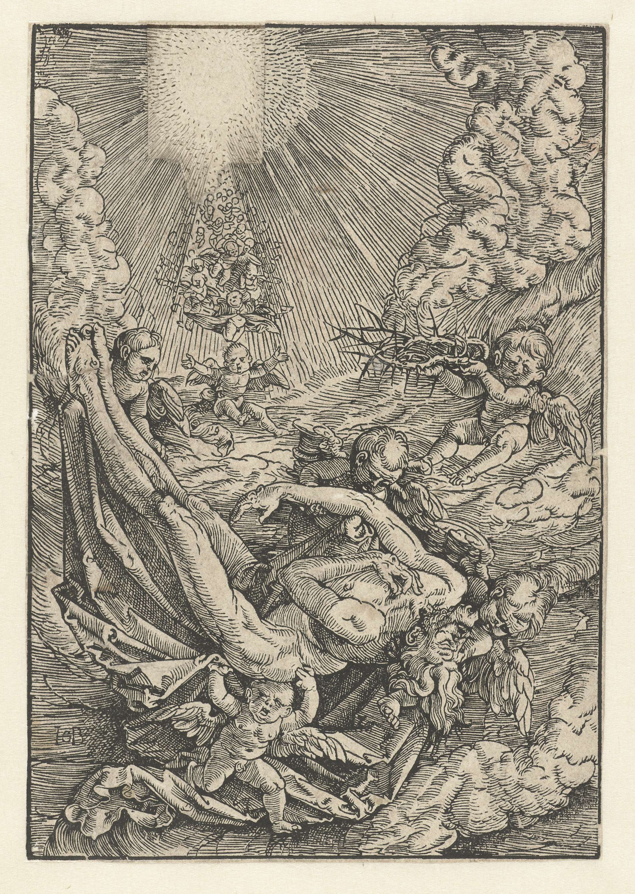 Het dode lichaam van Christus wordt door kleine engelen in een doek naar de hemel gedragen. Rechts zweeft een engel met de doornenkroon als verwijzing naar de Passie van Christus. Op de originele afdruk is God de Vader en de Heilige Geest in de stralenkrans boven de engelenkoren weergegeven. Dit fragment ontbreekt hier, mogelijk is ...