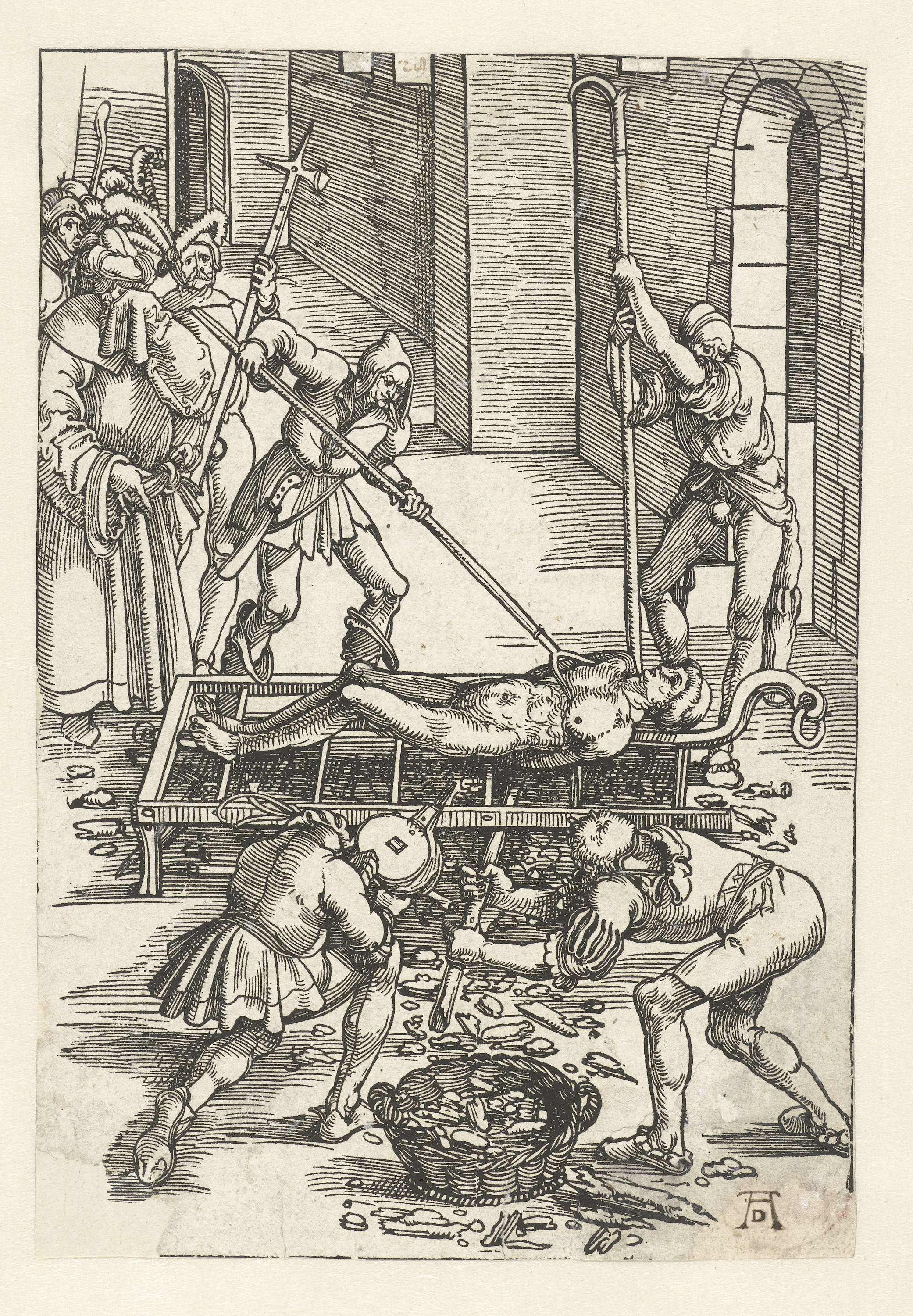 De naakte Laurentius wordt levend geroosterd onder toeziend oog van een Romeinse prefect en zijn gevolg. Mannen rakelen het vuur onder het rooster op en wakkeren het met een blaasbalg aan. Een man duwt Laurentius met een vork in een liggende pose op het rooster.