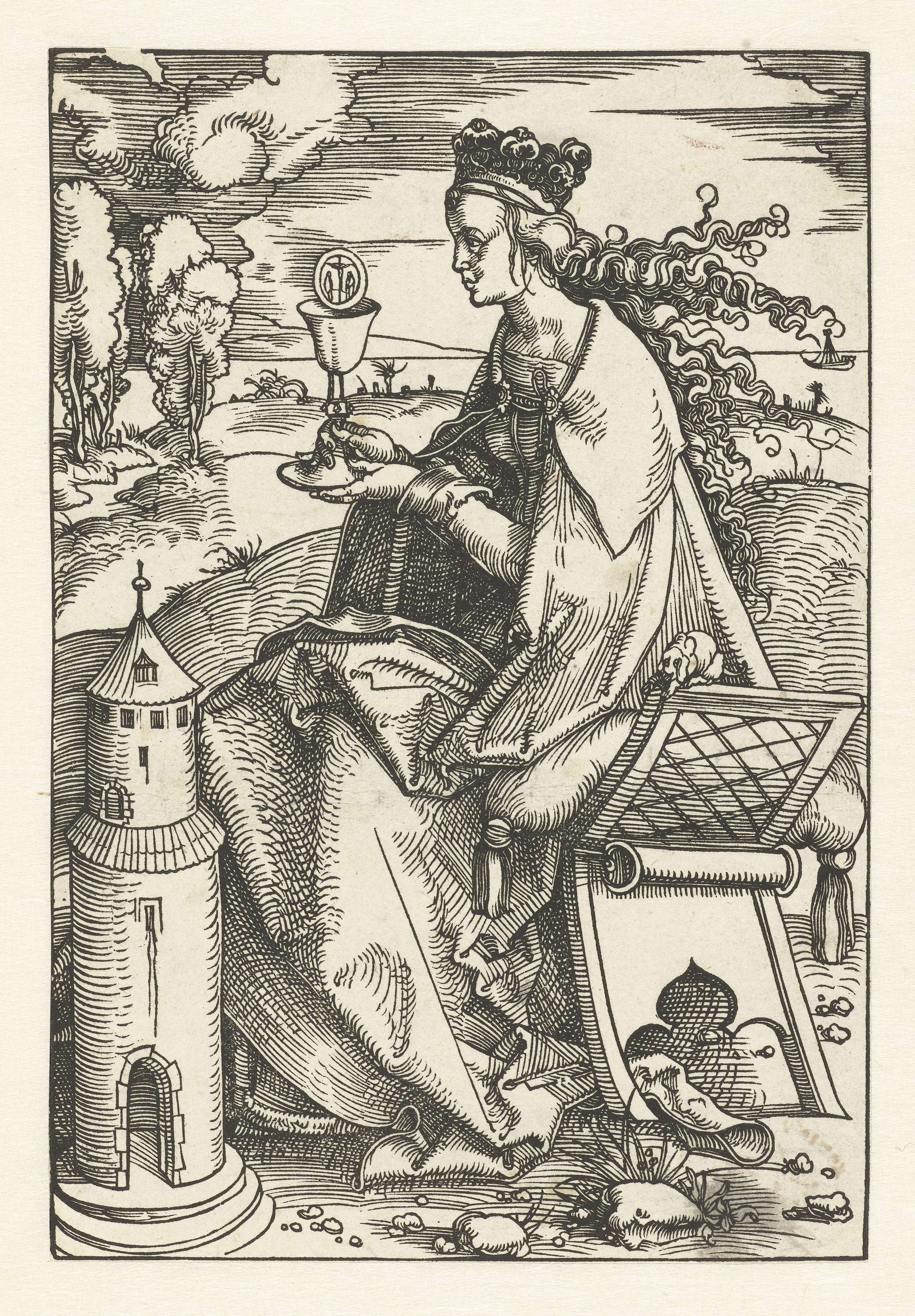 De heilige Barbara zit naar links gewend op een stoel, zij draagt een kroon en houdt een miskelk met hostie in haar handen. Voor haar op de grond staat haar attribuut, de toren. Op de stoel zit een ondefinieerbaar klein dier. Op de achtergrond is een landschap met een zeegezicht weergegeven.