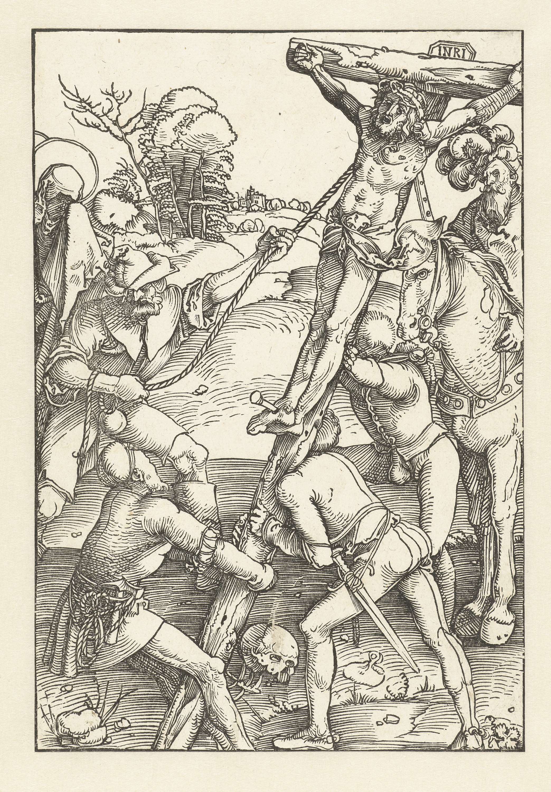 Christus hangt aan het kruis dat door vier mannen wordt opgericht. Links staat de treurende Maria die haar tranen droogt en rechts staat Pilatus te paard.