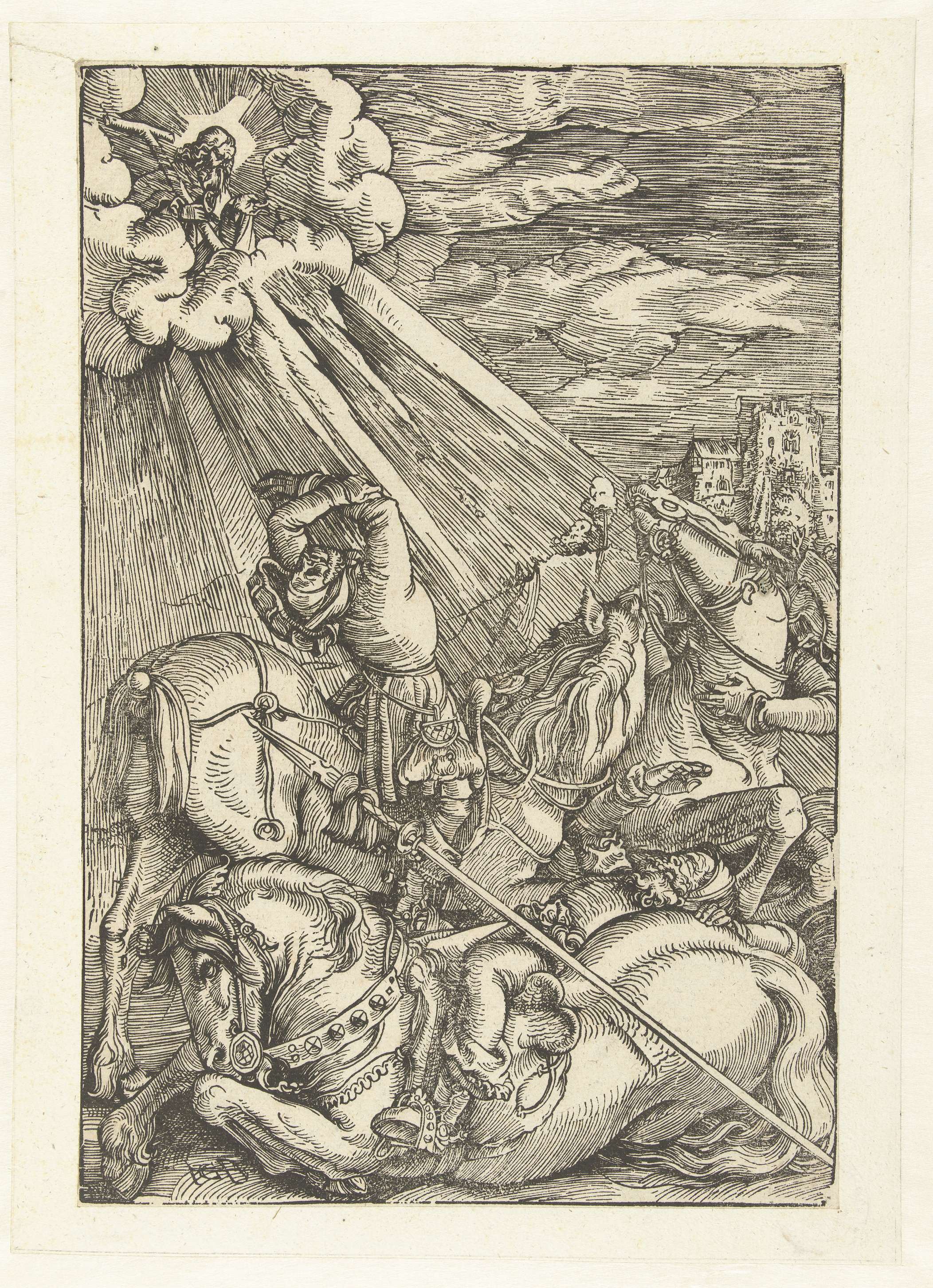 Paulus wordt onderweg naar Damascus verblind door fel licht uit de hemel. De apostel en zijn dienaren vallen van hun paarden die verschrikt reageren. Op de voorgrond ligt een paard op de grond en rechts steigert een dier terwijl zijn berijder zich aan zijn hals vastgrijpt. In de hemel verschijnt tussen wolken Christus met een ...