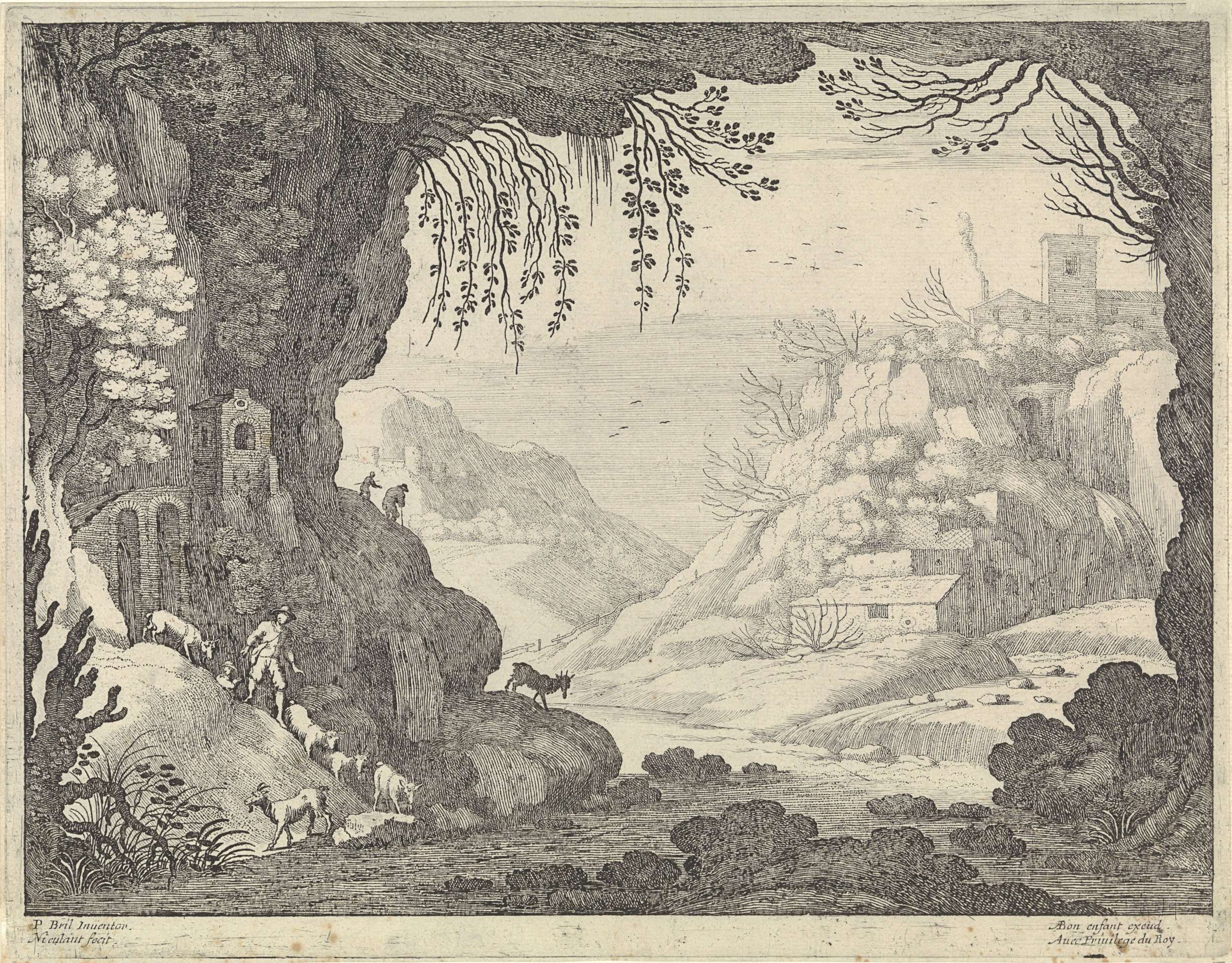 Vanuit een grot, waarin een rivier stroomt, uitzicht op een bergachtig landschap. Links op de oever twee herders met een kudde geiten.