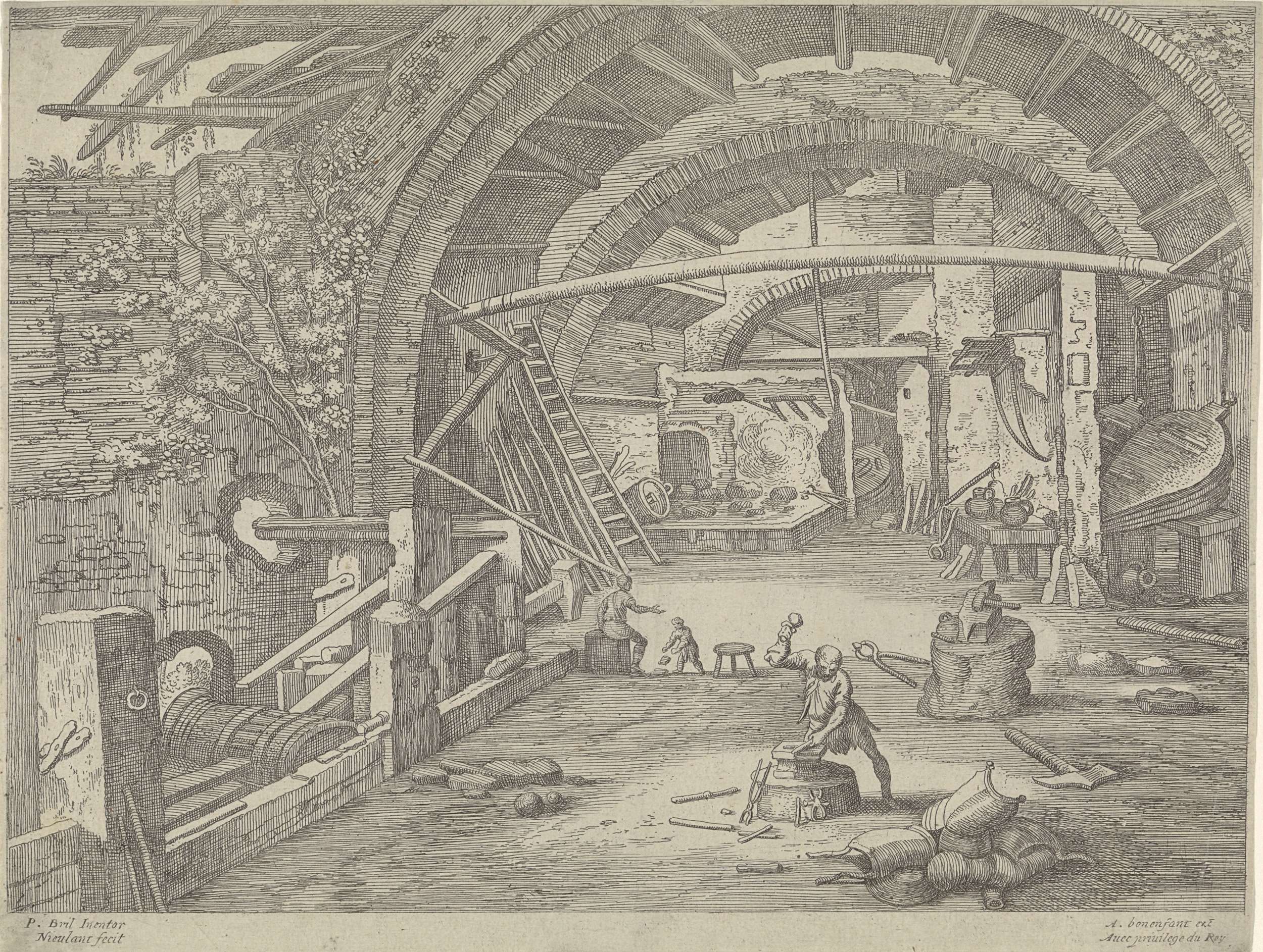 In een smederij slaat de smid op het aambeeld. Er liggen verschillende werktuigen op de grond. Links zit een jongen naast een klein kind. Rechts aan de zijkant hangt een grote blaasbalg. Op de voorgrond liggen onderdelen van een harnas.