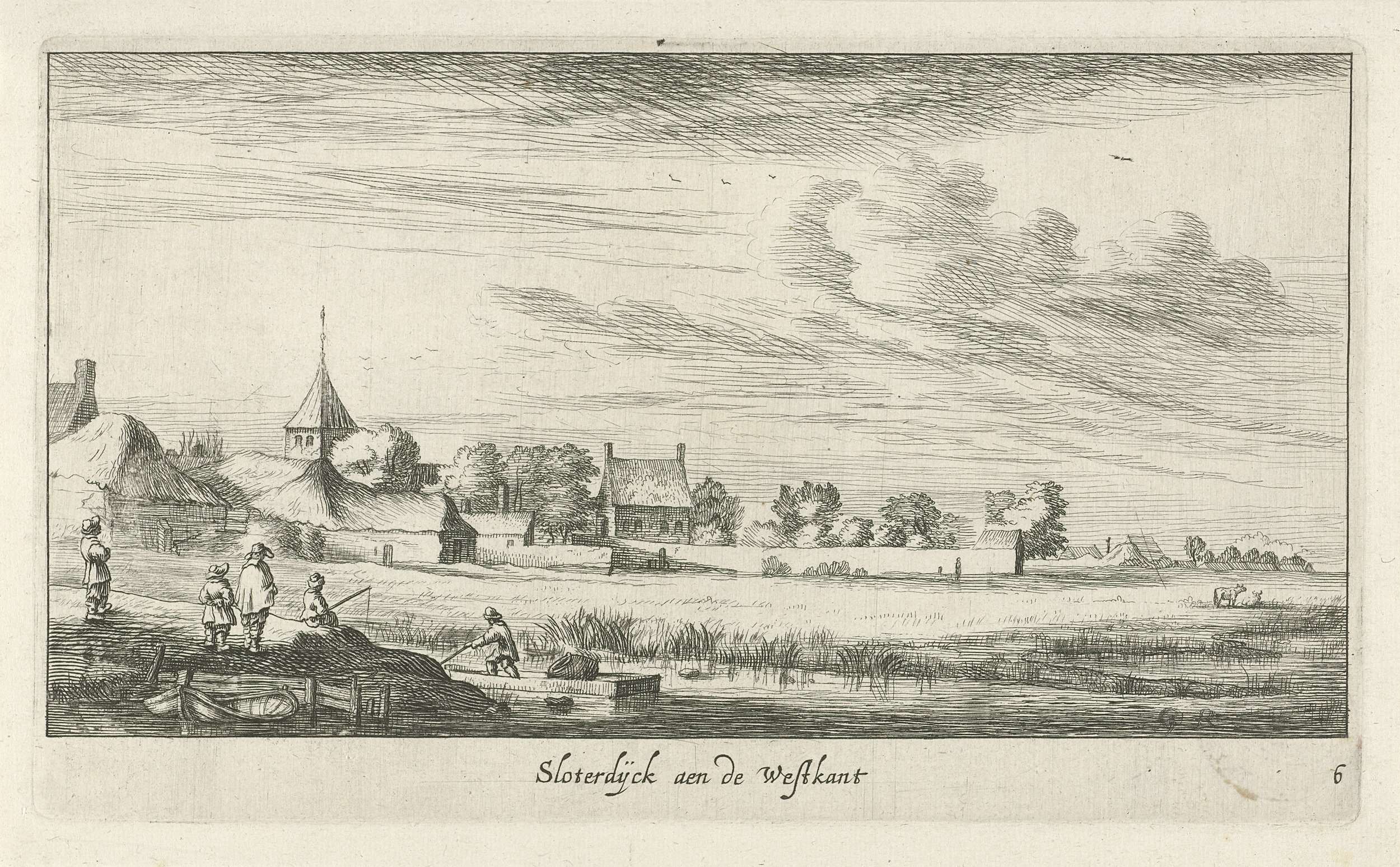 Gezicht op Sloterdijk vanuit het westen, met bebouwing langs de Spaarndammerdijk. Op de voorgrond enkele vissers en links de toren van de Petruskerk. De prent is deel van een serie landschappen met dorpen rondom Amsterdam. Rechtsonder genummerd: 6.