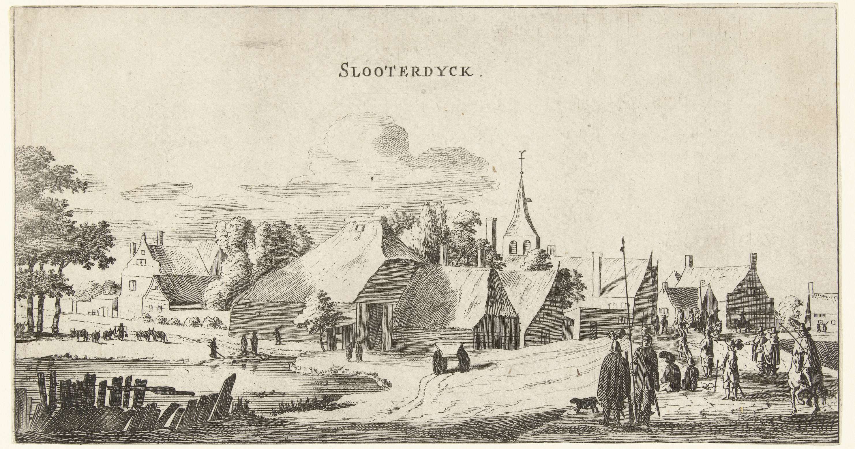 Gezicht te Sloterdijk. Onderdeel van een serie van zes gezichten in de dorpen waar de troepen van prins Willem II ingekwartierd lagen tijdens het beleg van Amsterdam, van 30 juli tot 4 augustus 1650.
