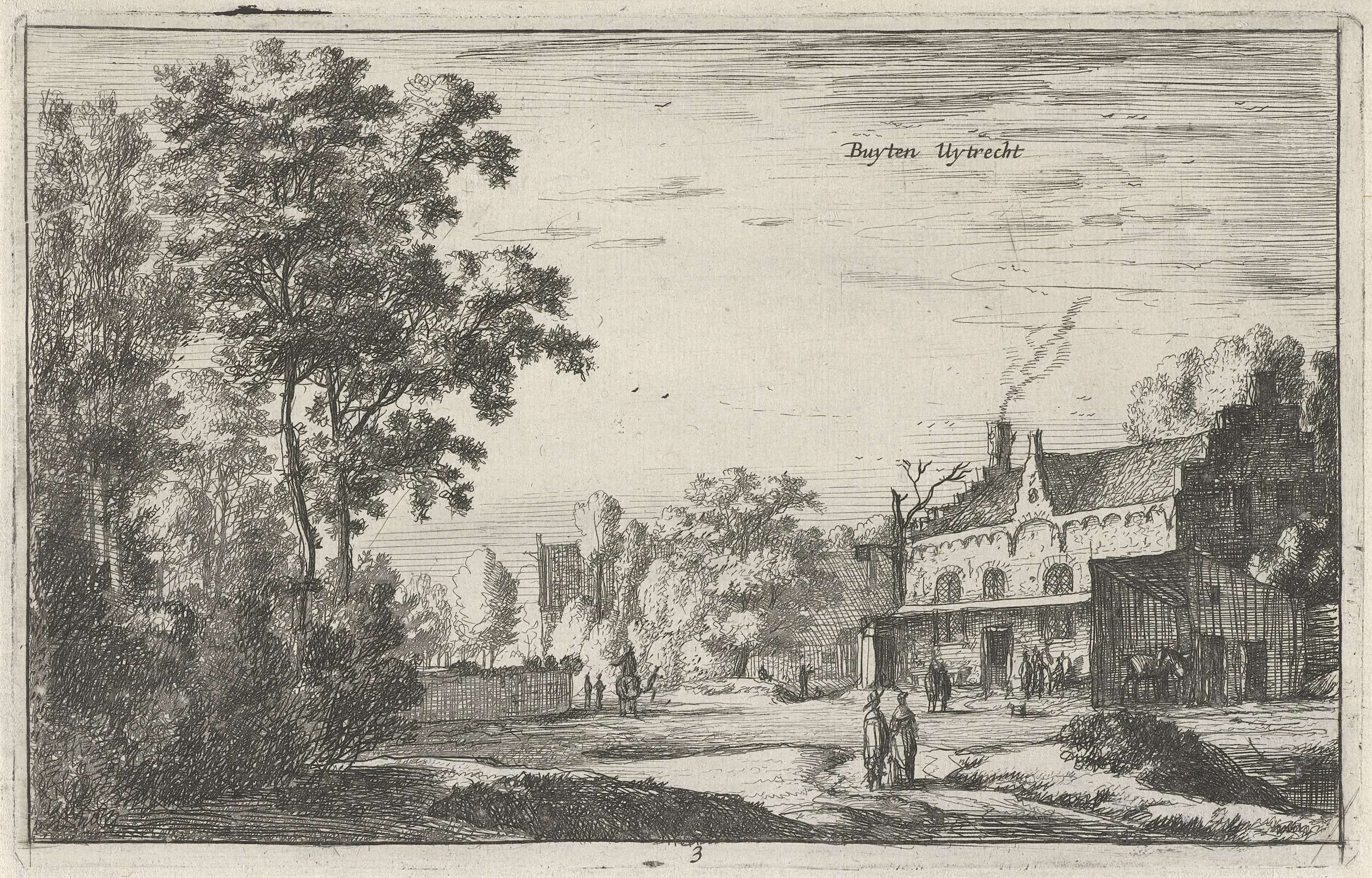 Gezicht vanuit een bos op enkele huizen in de omgeving van Utrecht. Rechts mogelijk een herberg. Op de voorgrond een aantal passanten. Genummerd onderaan in de marge: 3.
