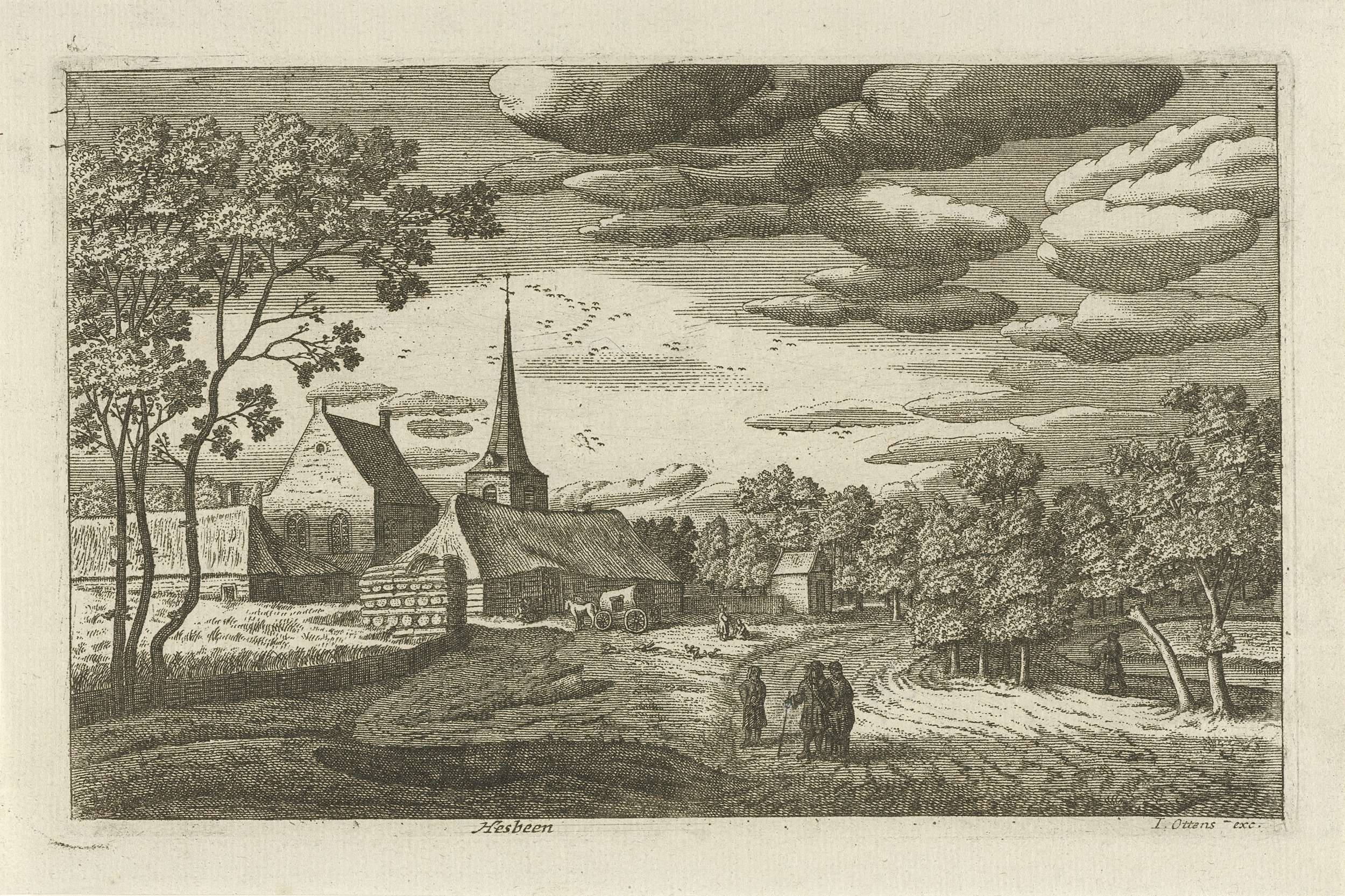 Gezicht op het dorp Heesbeen bij Heusden. Links het dorp met de kerk en op de voorgrond enkele passanten.