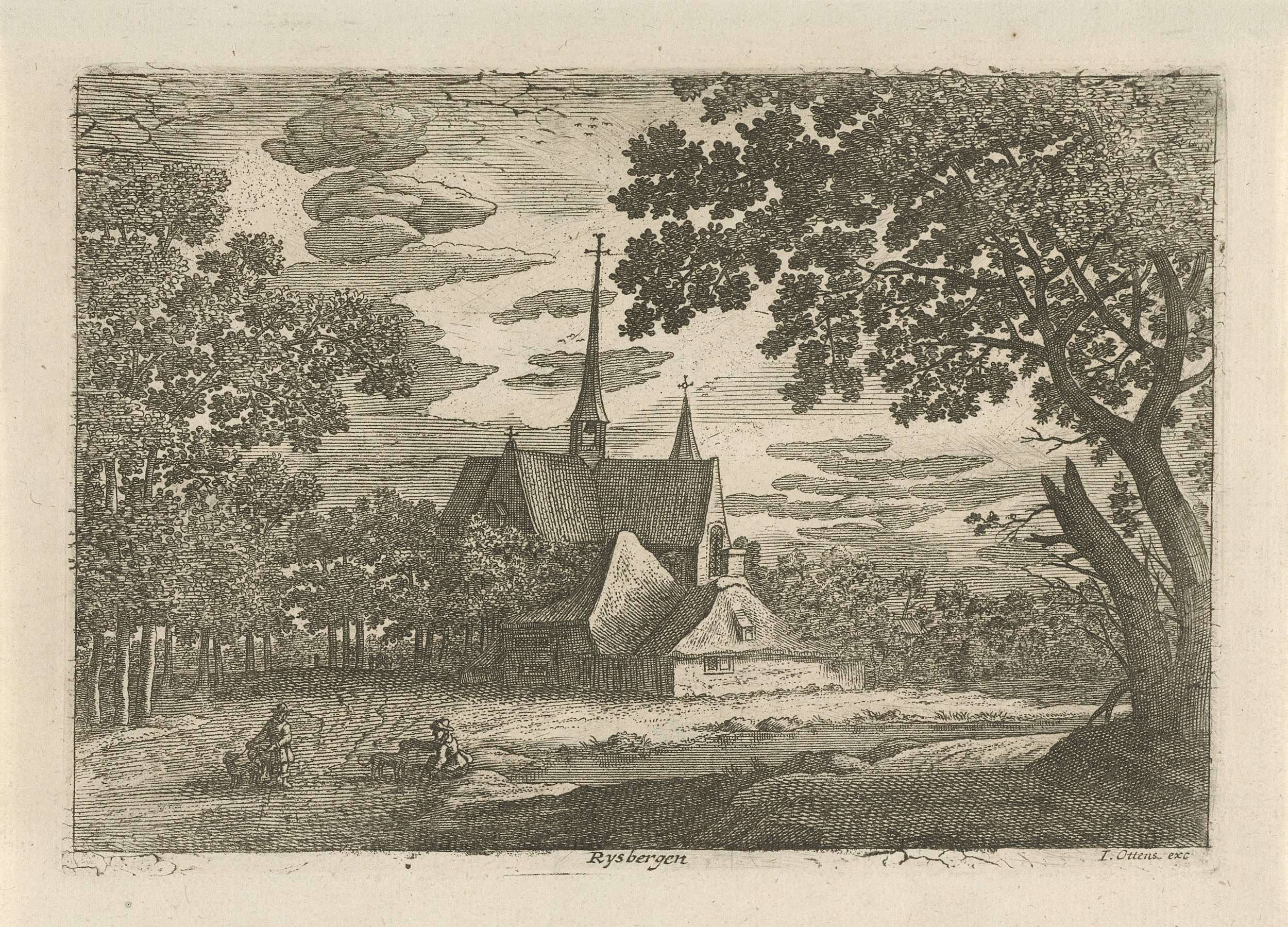 De oude kerk van Rijsbergen, gewijd aan Hl. Bavo en Hl. Barbara. Op de voorgrond een watertje en twee figuren met honden.
