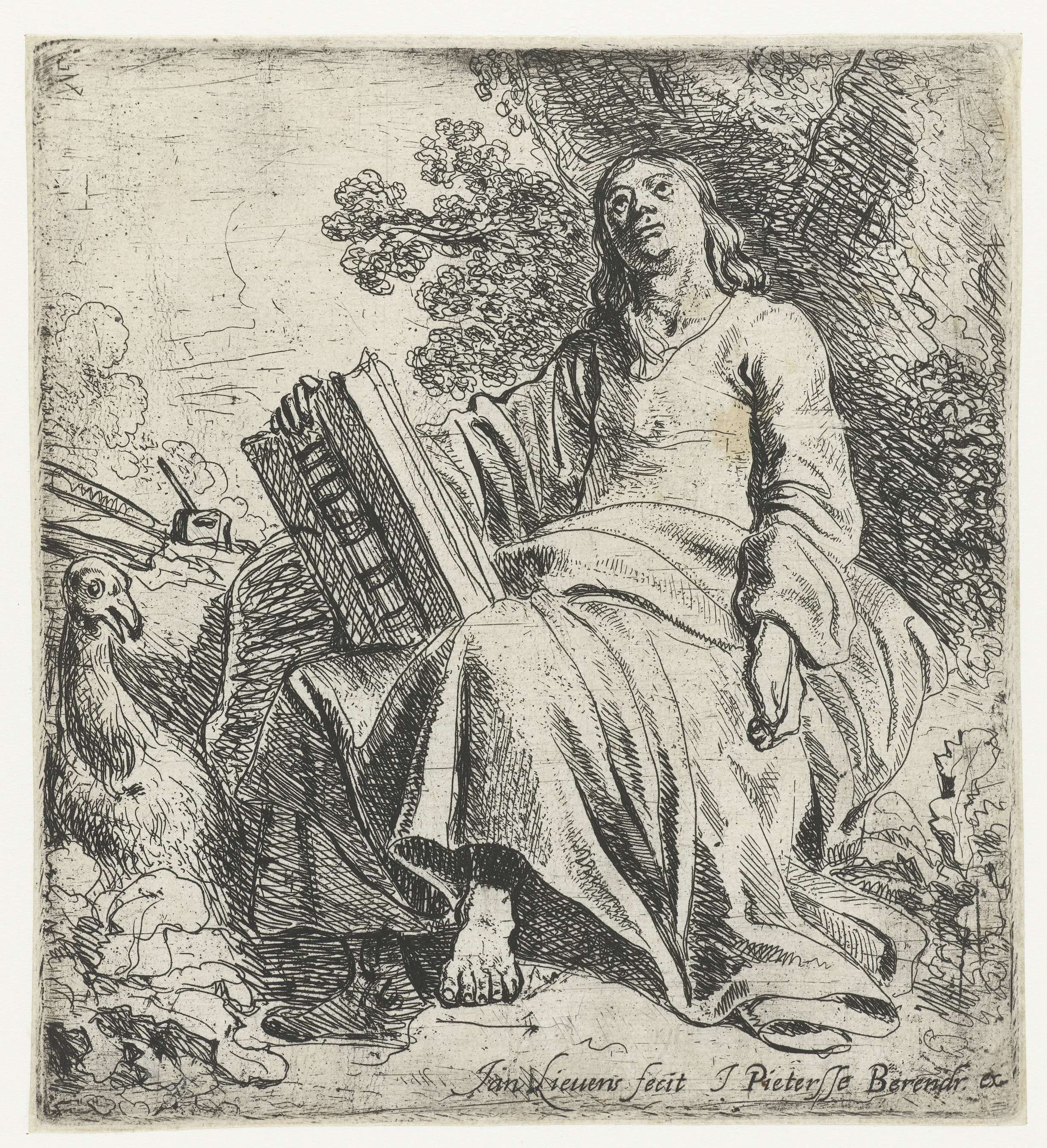 De figuur van de omhoogkijkende Johannes is groot in een landschap geplaatst. Hij houdt met zijn rechterhand het boek vast en naast hem staat zijn attribuut, een adelaar. Daarachter zijn pen en inktkoker weergegeven.