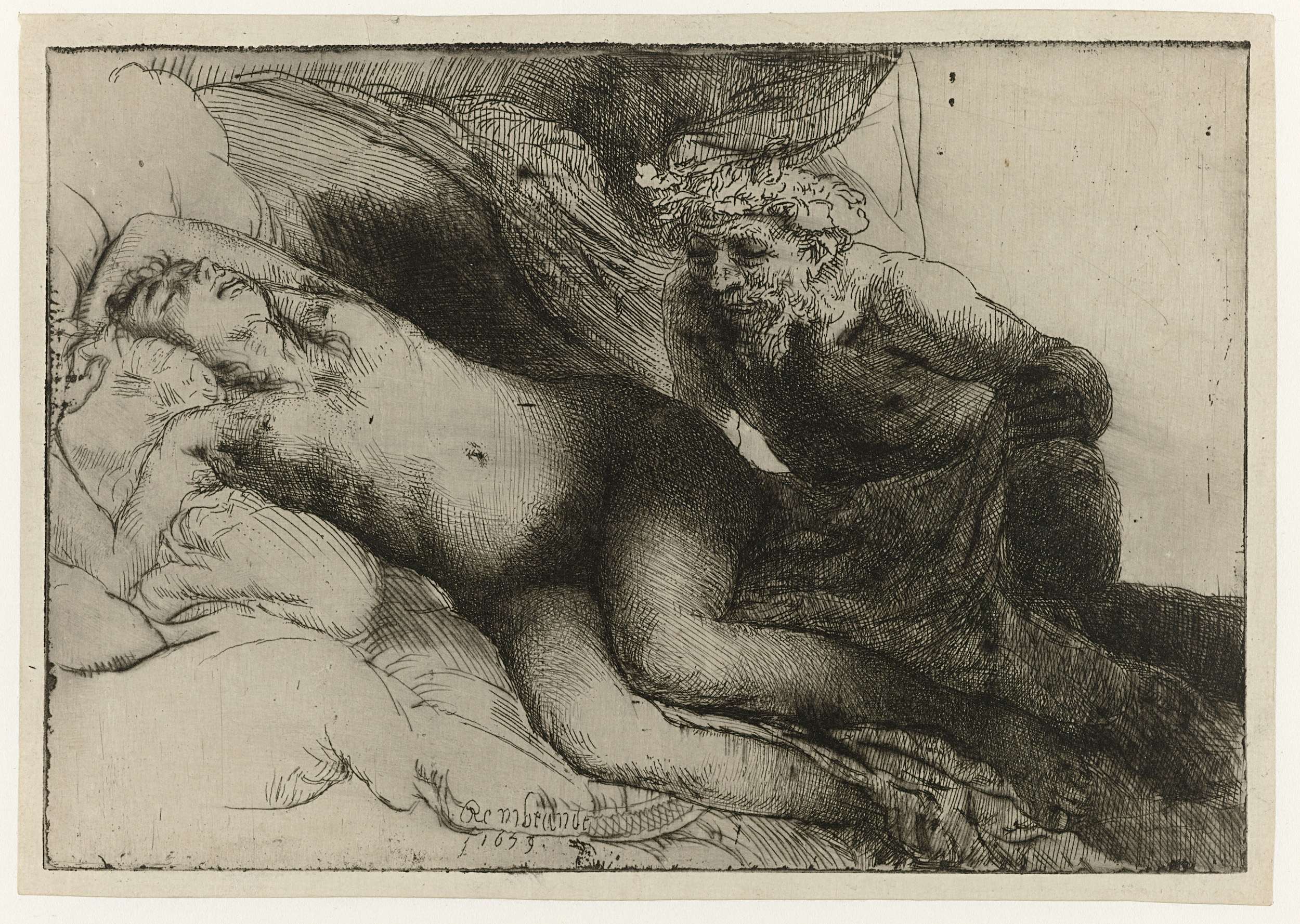 Rembrandt geeft de slapende Antiope zo overtuigend weer dat het lijkt alsof hij een model dat daadwerkelijk diep onder zeil was, heeft nagetekend. Ze ligt in een totaal ontspannen houding met haar mond open en haar armen bij haar hoofd. Ook hier bezoekt Jupiter, vermomd als sater, Antiope ’s nachts in haar bed. Voorzichtig tilt ...
