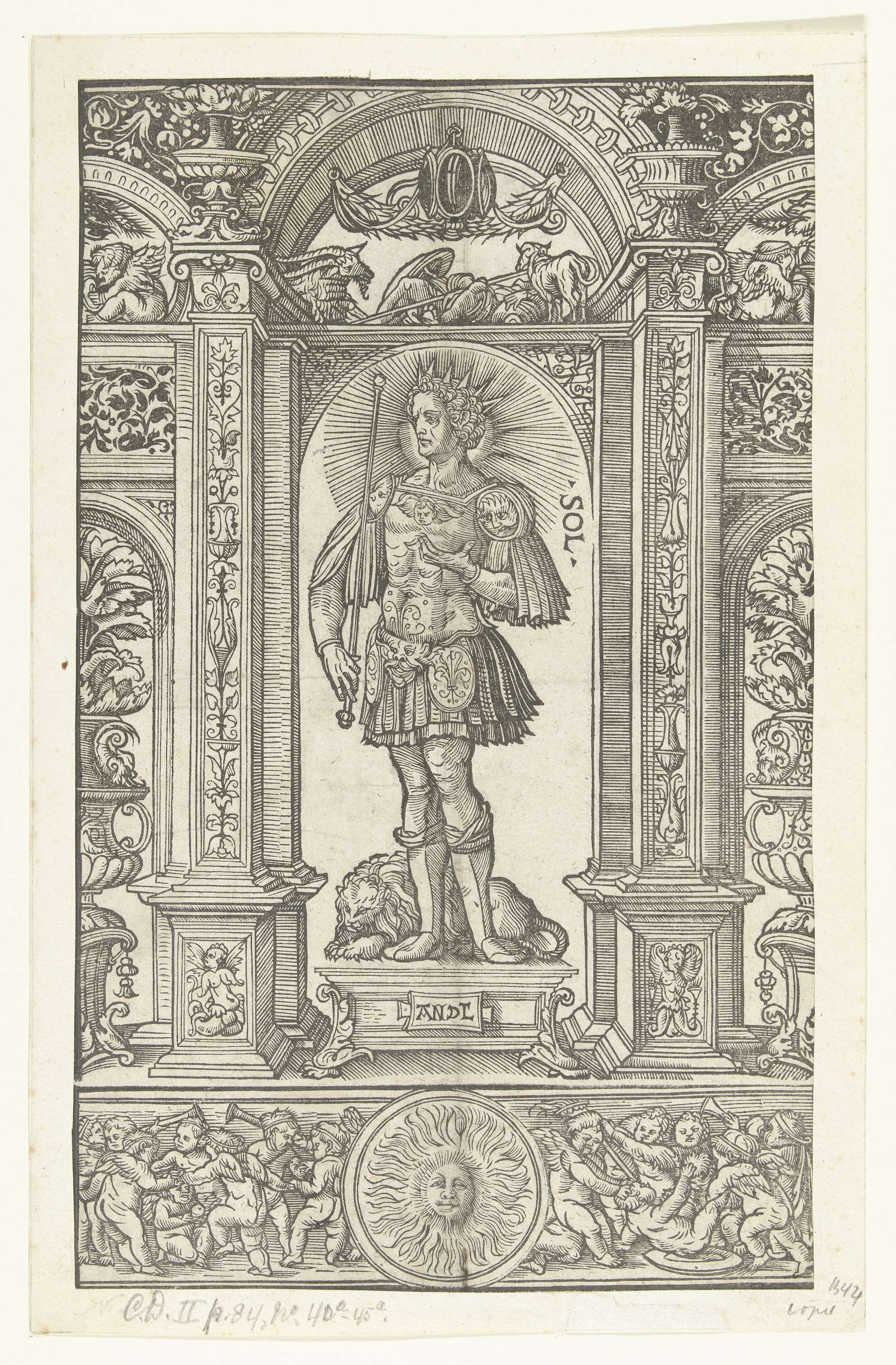 De god Apollo of Sol als personificatie van de planeet Zon met als attributen een scepter en een kroon en de zon. Bij zijn voeten ligt het sterrenbeeld Leeuw, zijn planetenkind. Hij staat op een voetstuk in een architecturale omlijsting versierd met ornamenten. In de fries onderaan is in een medaillon de zon met een ...