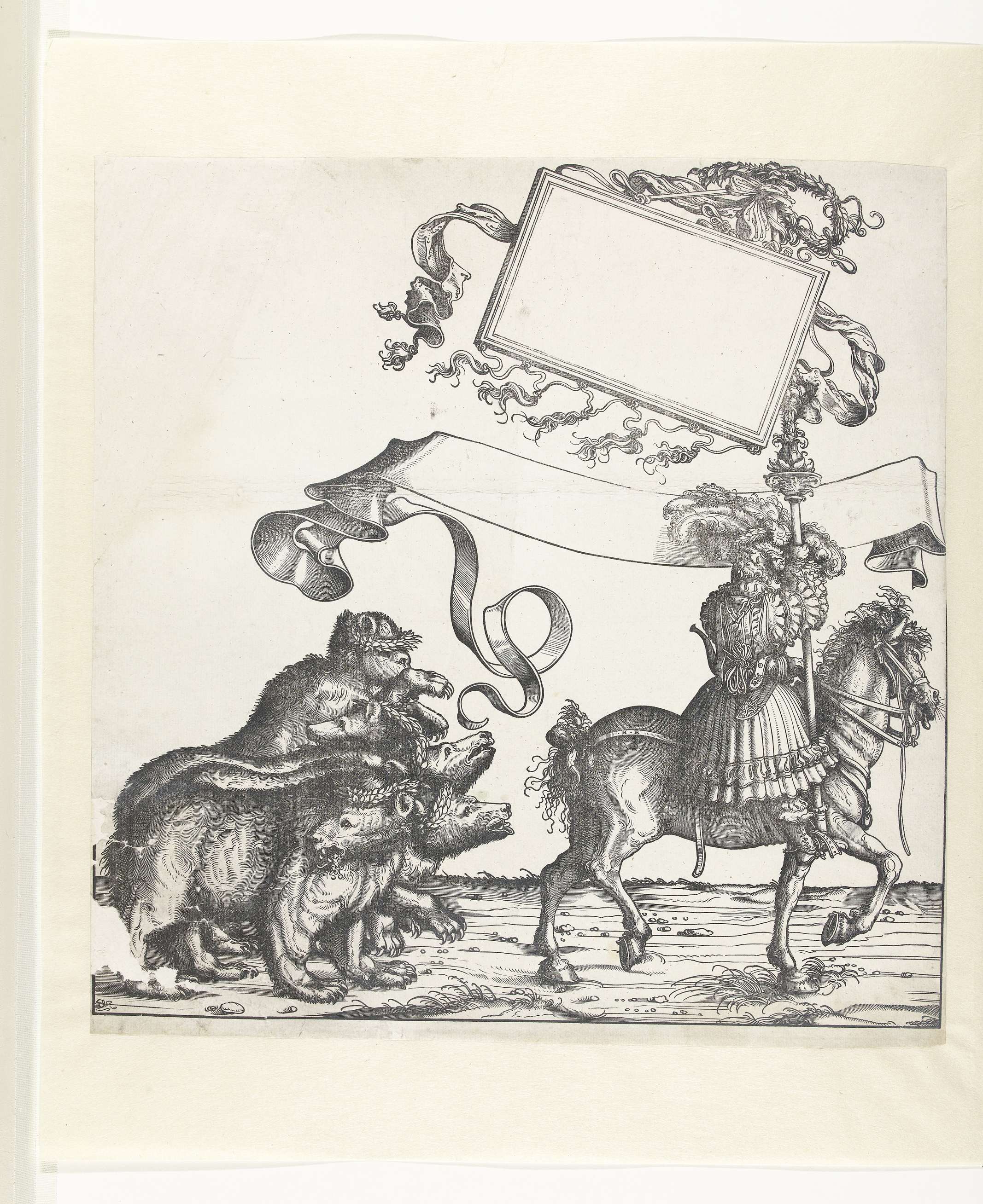 Vijf beren met lauwerkransen op hun kop lopen op een rij. Zij maken deel uit van een triomftocht van keizer Maximiliaan I. Voor hen uit loopt een jager als standaarddrager te paard. Hij draagt een jachthoorn en een standaard met een lege cartouche met ruimte voor tekst. Boven de ruiter is een lege tekstband afgebeeld.