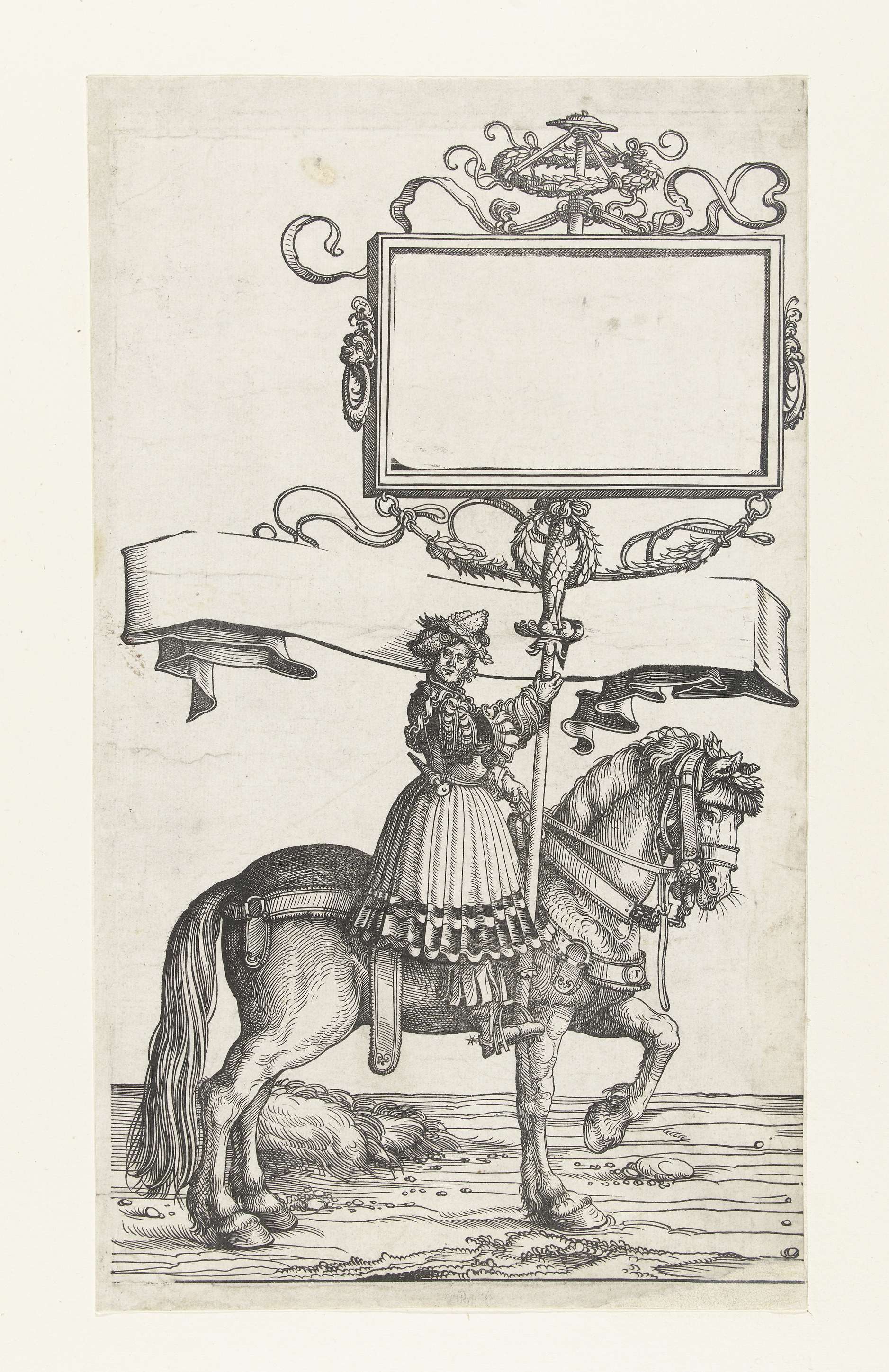 Standaarddrager met standaard en rechthoekig schild dat ruimte biedt voor een vers. De standaard is versierd met lauwerkransen en krullende linten. Ter hoogte van het hoofd van de ruiter is een lege tekstband weergegeven. Deze man loopt in de serie van de triomf van keizer Maximiliaan I vooruit aan de groep van vijf hofmaarschalken. In ...