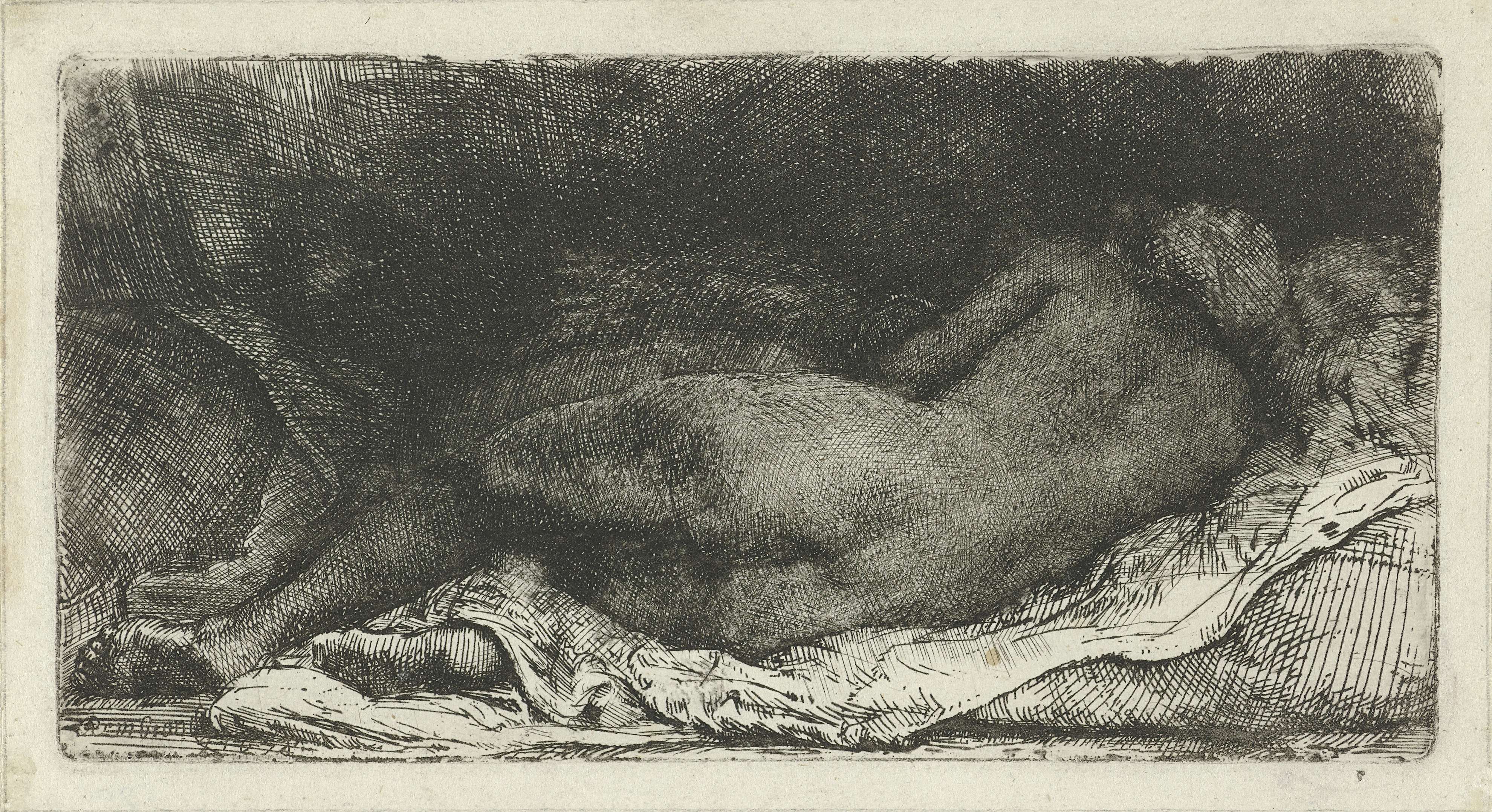 Liggende naakte vrouw, op de rug gezien, in het donker.