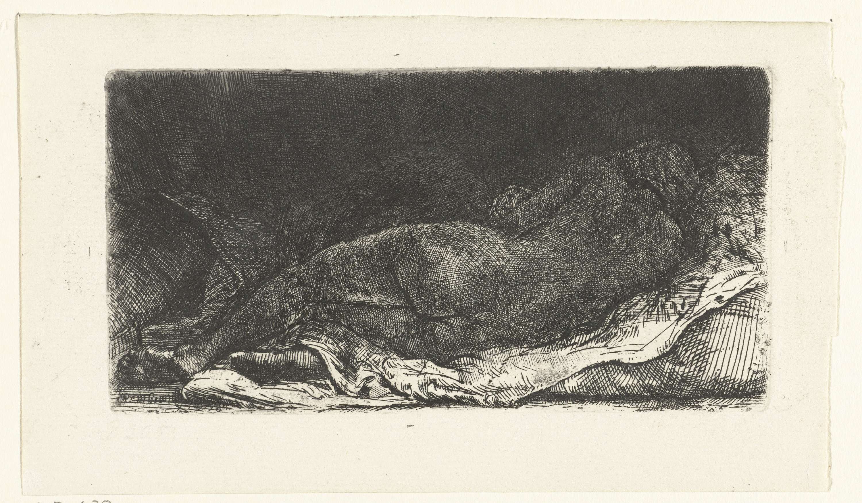 Liggende naakte vrouw, op de rug gezien, in het donker.