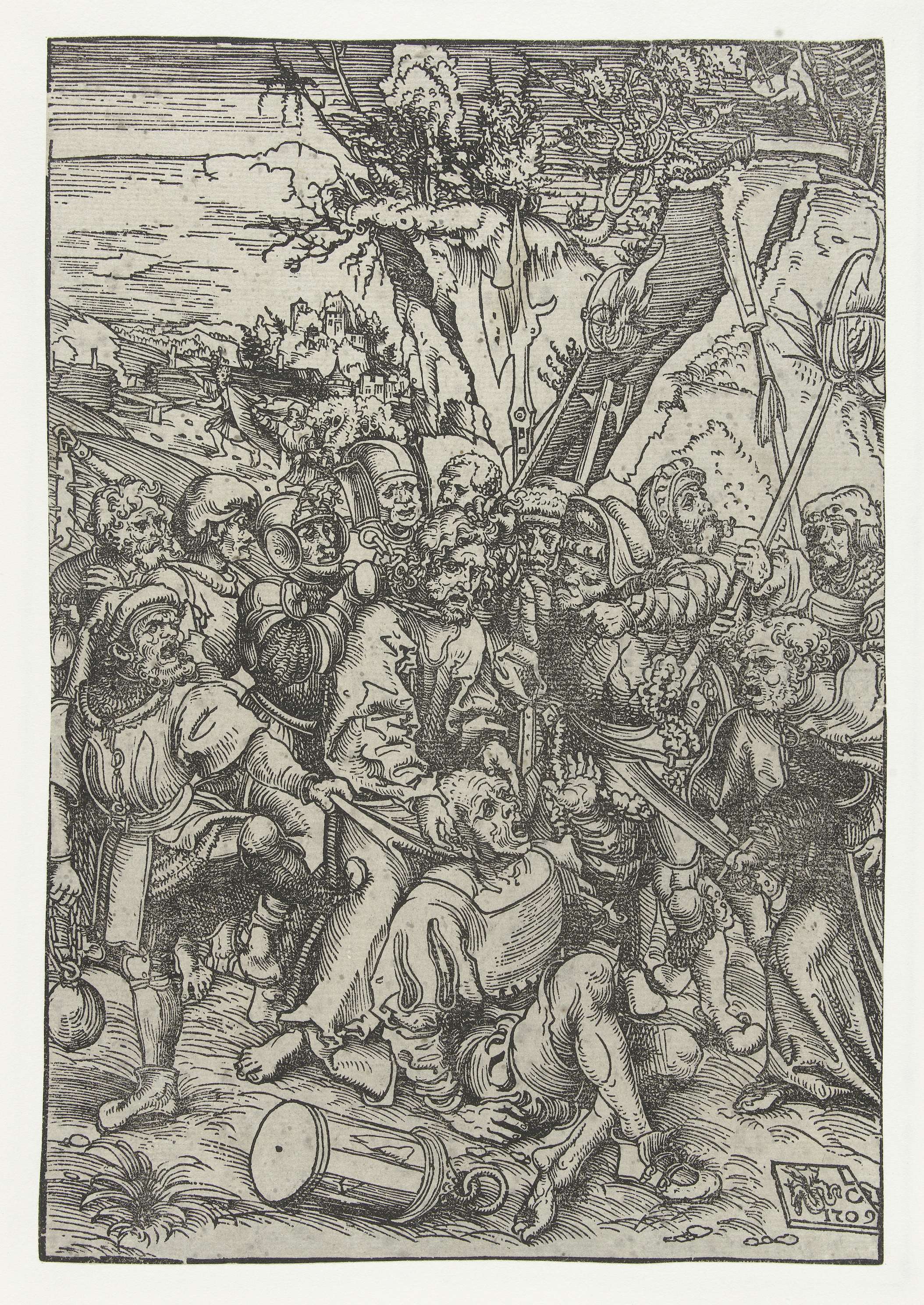 Christus wordt in de hof van Getsemane gevangen genomen door soldaten die zich met hellebaarden, knotsen en fakkels rond hem verzamelen. Hij wordt geketend bij zijn nek. Simon Petrus heeft met een zwaard het rechteroor van de slaaf Malchus afgeslagen en deze man wordt door Christus genezen. Rechtsboven het keurvorstelijk en hertogelijk wapen van Saksen ...