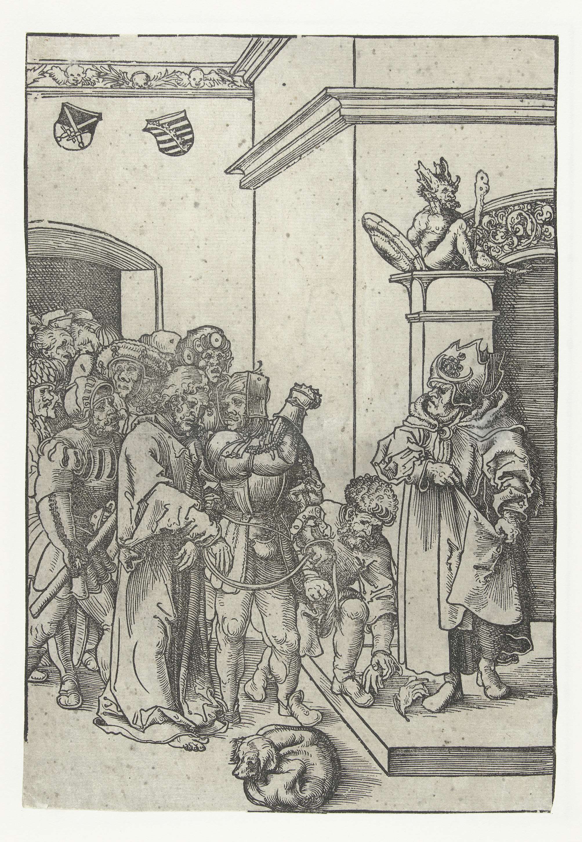 Christus wordt door soldaten voor de hogepriester Kajafas geleid. De hogepriester heeft zijn handschoenen uitgetrokken en scheurt zijn kleren. De soldaat naast Christus staat op het punt om hem te slaan. Tegen de achterwand van het interieur boven de deuropening hangen twee keurvorstelijke en hertogelijke wapens van Saksen op schilden.