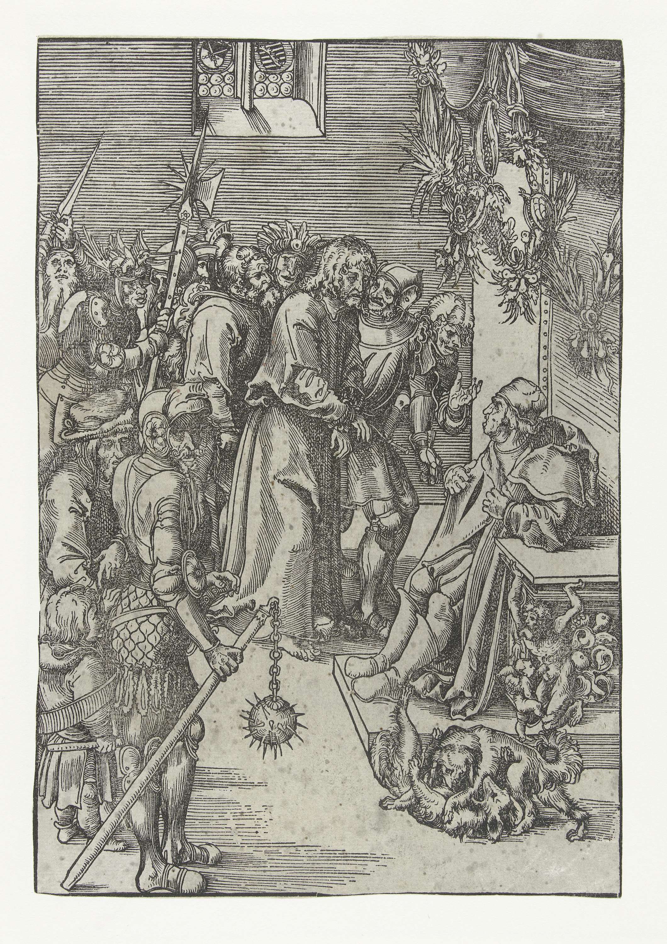 Christus wordt door soldaten bij Annas voorgeleid. Annas zit op een troon en spreekt tegen Christus. Op de grond vechten twee honden. Op het raam in de achterwand van het vertrek zijn het keurvorstelijk en hertogelijk wapen van Saksen op twee schilden weergegeven.