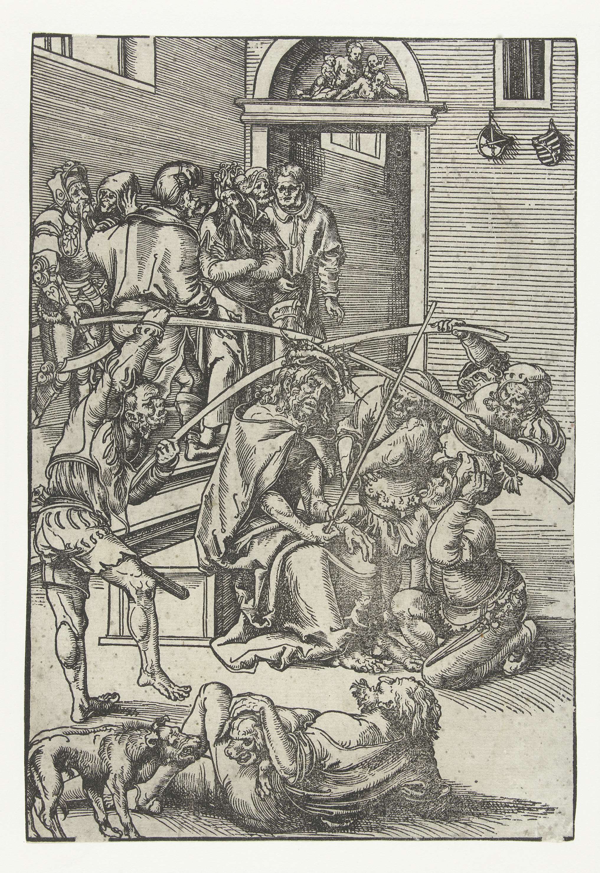 De soldaten van Pilatus hebben de zittende Christus gekroond met een doornenkroon, hem een mantel aangetrokken en een scepter in de hand gegeven. Twee soldaten drukken met twee stokken de kroon met grote doorns stevig op het hoofd van Christus. Een man knielt voor hem terwijl hij spottend zijn tong uitsteekt, een andere man ligt ...