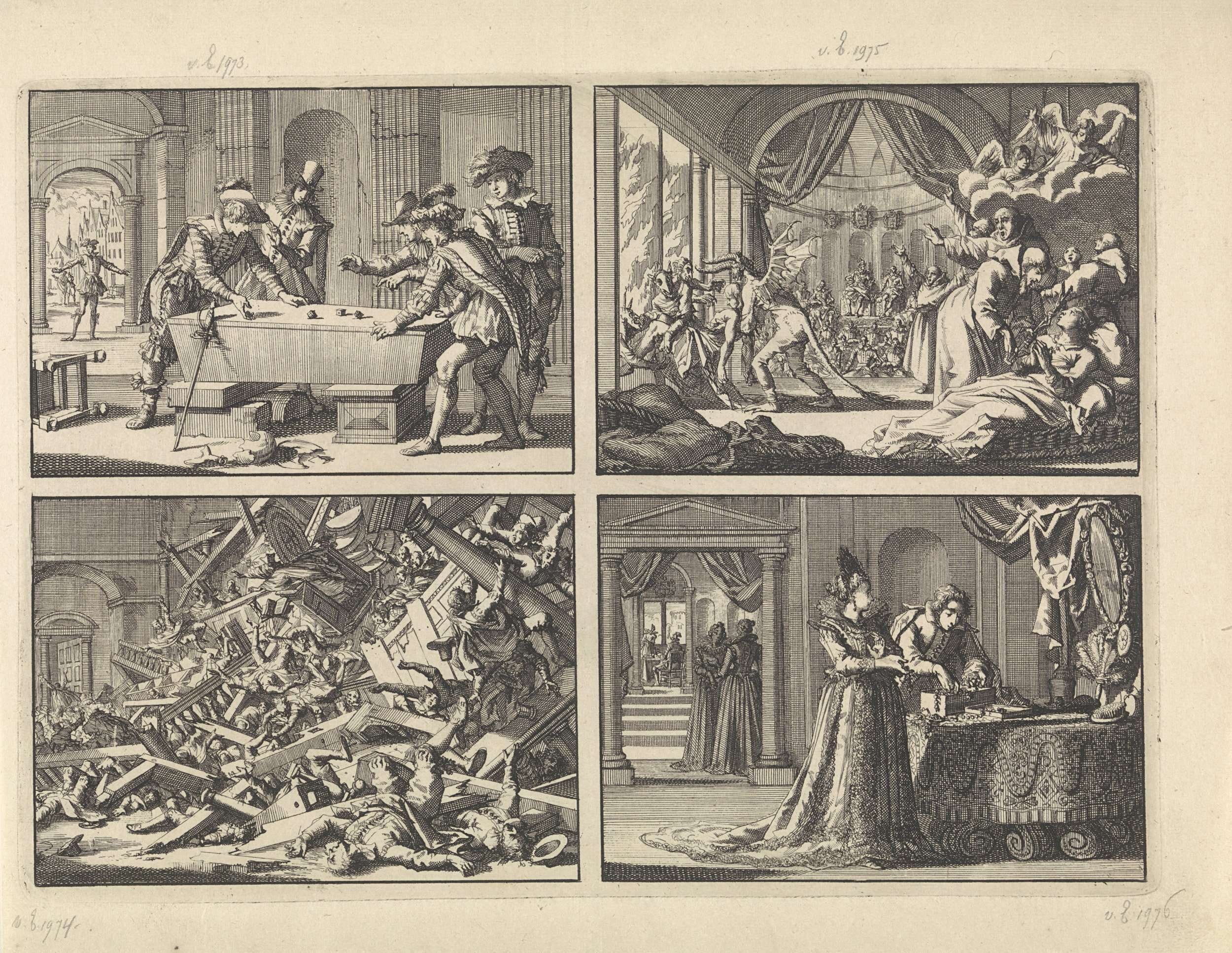 Lakeien dobbelen op de lijkkist van de hertog van Luynes, 1621 / Satyrische toneelvoorstelling door koning Filips IV van Spanje gegeven aan zijn gast Karel I van Engeland, 1623 / Ingestorte galerij tijdens een katholieke godsdienstoefening in het huis van de Spaanse gezant te Londen, 1623 / Vermomd als juwelier brengt Gustaaf II Adolf zijn ...