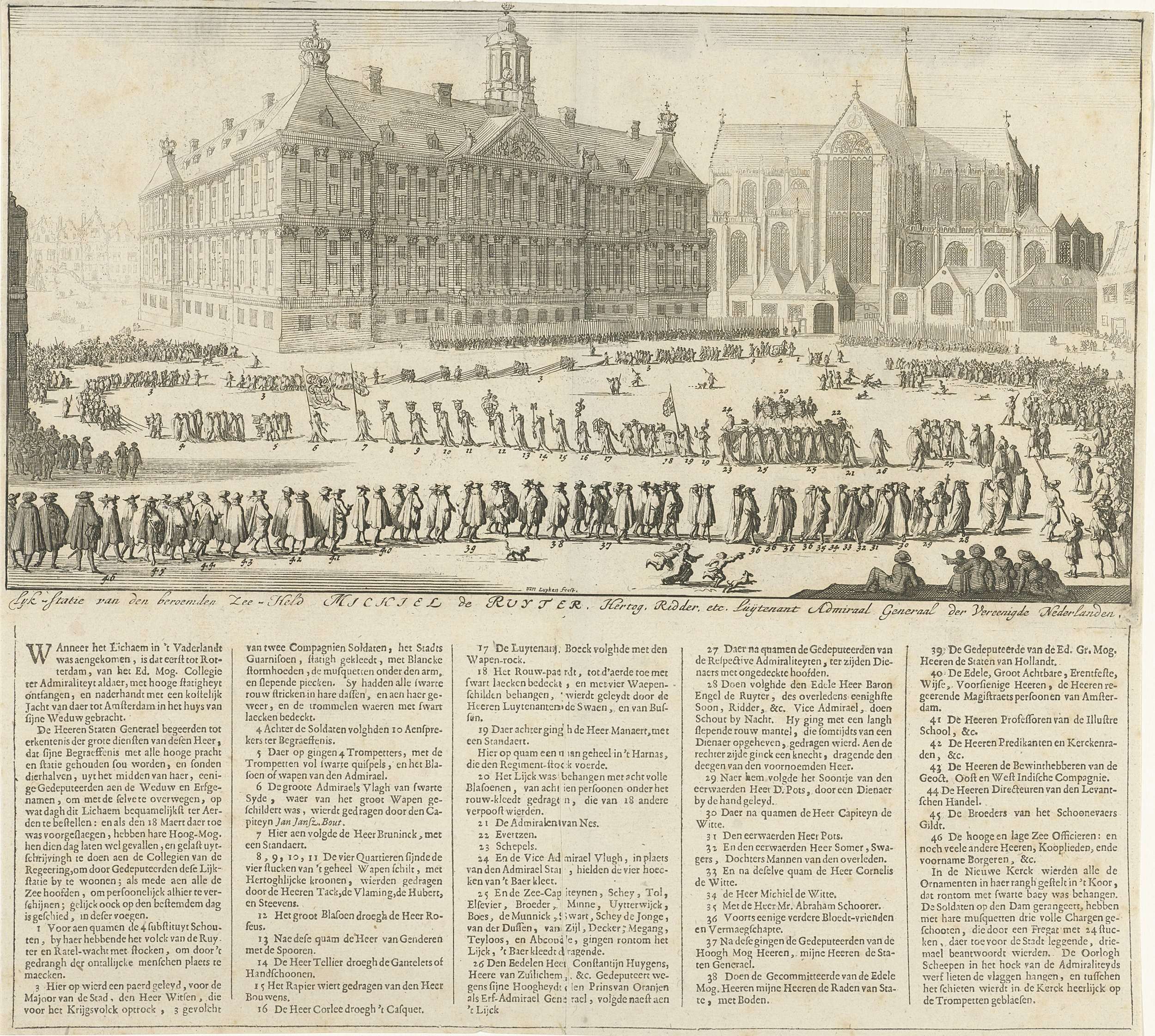 De begrafenisstoet van Michiel Adriaenszoon de Ruyter te Amsterdam op 18 maart 1677. De stoet gaat over de Dam langs het stadhuis naar de Nieuwe Kerk. Onder de voorstelling de titel. Daaronder uitleg en de legenda 1-46 in vijf kolommen in boekdruk.